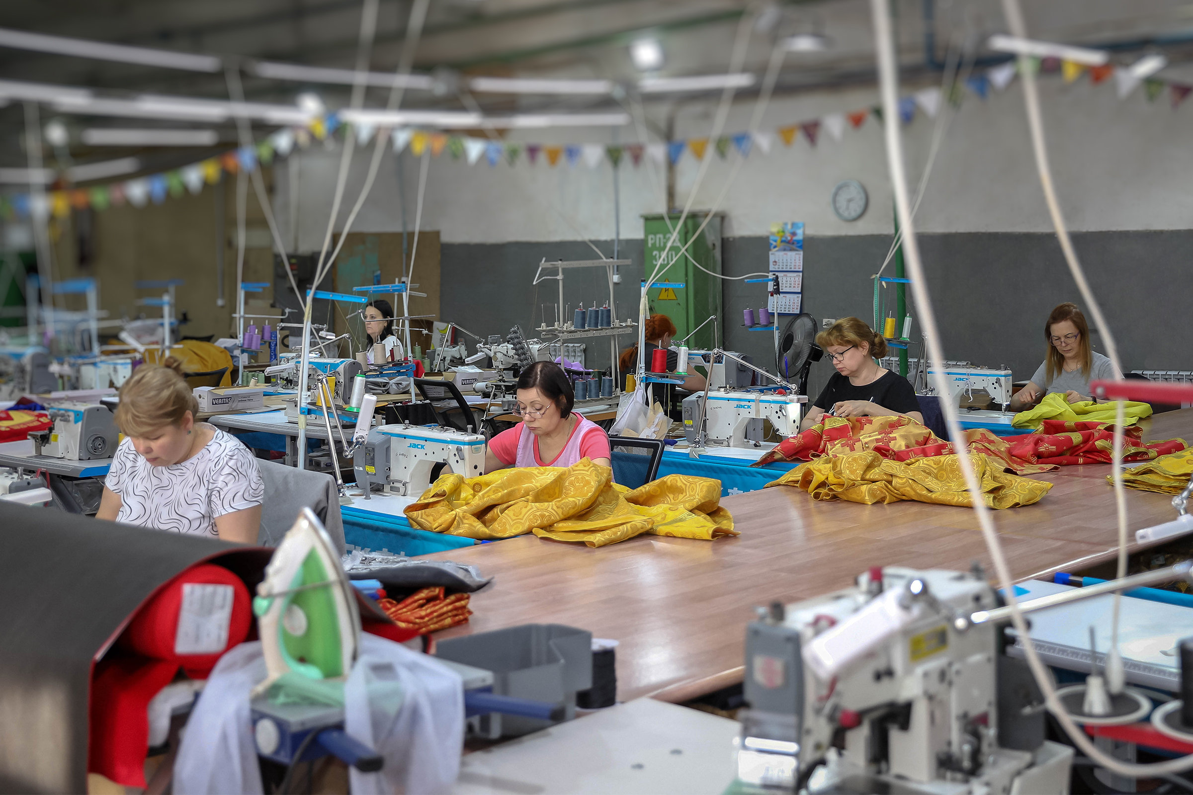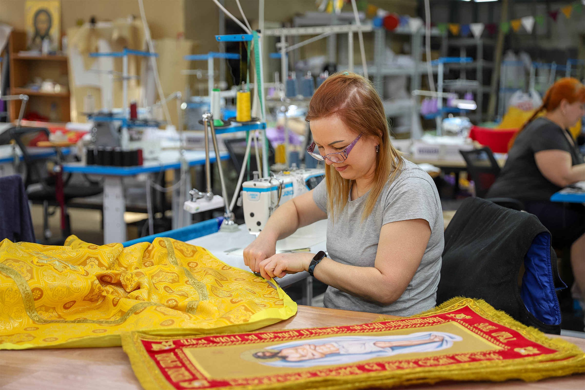 Облачения для священнослужителей, плащаницы, хоругви, орлецы, текстильное убранство храма – всё это с любовью и тщанием создают специалисты цеха. Современное оборудование позволяет быстро, качественно и сравнительно недорого выполнять сложные изделия, привлекающие взор своей красотой. Яркий пример этого – плащаницы, один из главных атрибутов богослужений Страстной седмицы. Образ Спасителя, лежащего во гробе, и обрамляющие его орнаменты вышивают тончайшими нитями с помощью современных станков с компьютерным управлением. Дизайнер разрабатывает рисунок в специальной программе, а умная машина в тончайших деталях воспроизводит его. Благодаря этому произведения в технике золотного и лицевого шитья, которые прежде были доступны лишь самым богатым монастырям и кафедральным соборам, приходят в обычные приходские храмы.