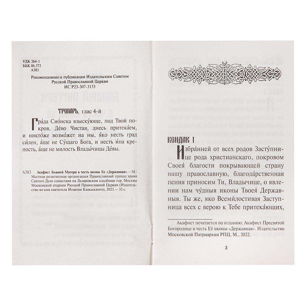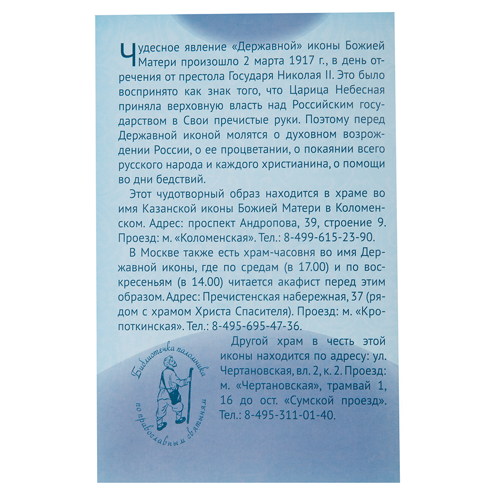Акафист Державной иконе Божией Матери поможет расширить ежедневное молитвенное правило и обрести молитвенное предстательство Пресвятой Девы. В издание включены интересные сведения об иконе и особенностях ее появления. Традиция указывает молиться перед Державной иконой Богородицы о духовном возрождении нашей страны, помощи во время бедствий, обращении народа к покаянию и пробуждении в нем стремления к праведной, благочестивой жизни.