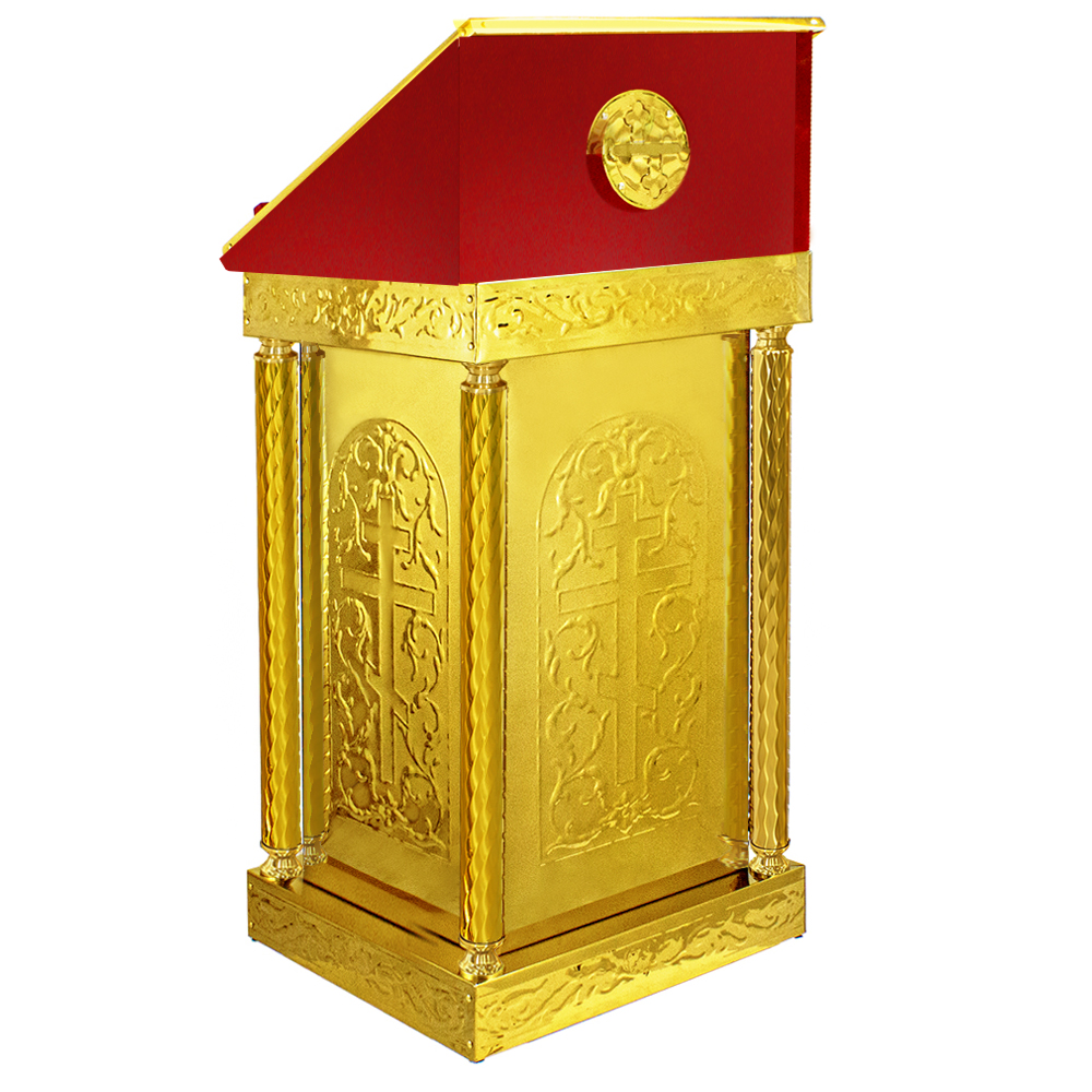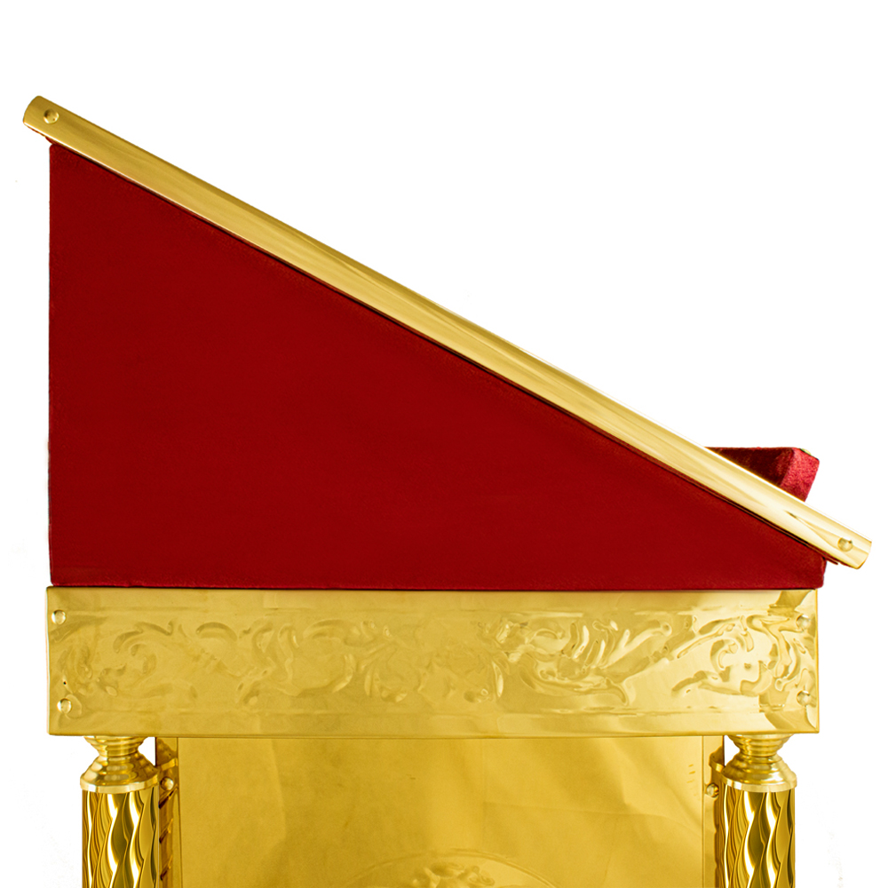 Классический металлический аналой с чеканкой и тканевой поверхностью подходит для любого интерьера храма.