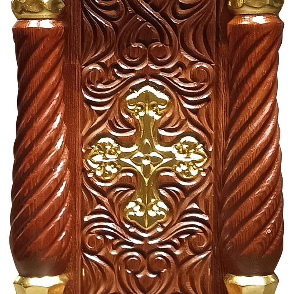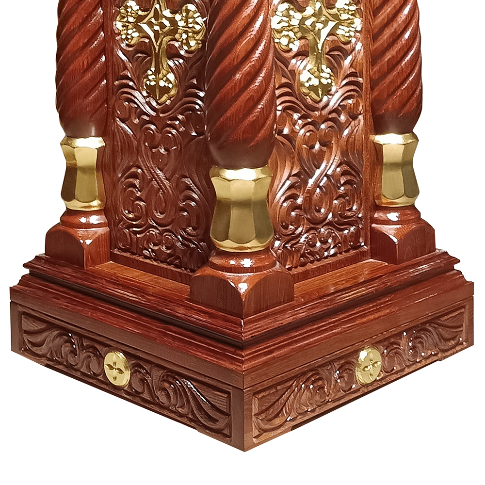 "Костромской" боковой аналой будет выигрышно смотреться в любом, даже небольшом храме. С четырех сторон предмет украшен изящной резьбой в виде растительного узора с традиционными крестами. Благодаря высокому резному подиуму и объемным колоннам, аналой смотрится очень солидно. А если вы хотите выдержать храмовый интерьер в одном стиле, рекомендуем дополнить аналой другими изделиями из этой серии.