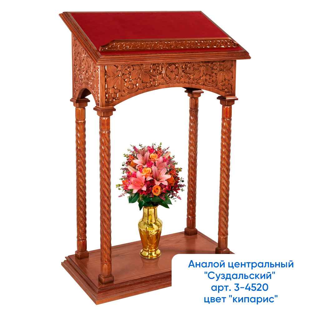 Боковой аналой серии «Суздальская» изготовлен из разных сортов натуральной древесины. Конструкция на высоких витых колоннах богато украшена декоративной резьбой, поверхность закрыта плотной мебельной тканью. Модель выполнена в цвете «кипарис».
