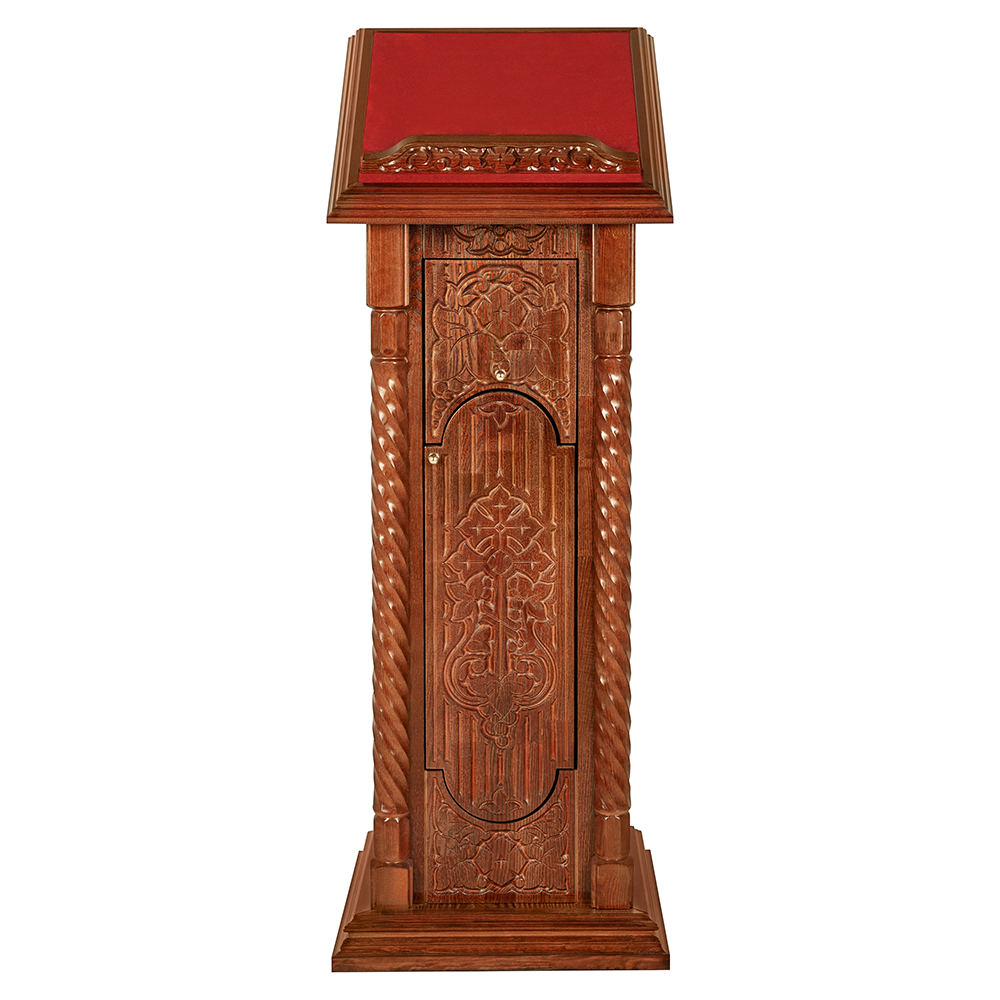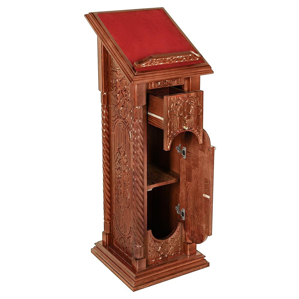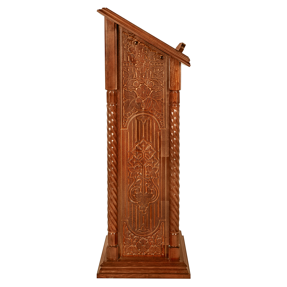Боковой аналой из массива дерева с тонировкой под кипарис украсит интерьер храма в классическом или современном стиле. С четырех сторон корпуса методом рельефной резьбы нанесен орнамент "виноградная лоза", композицию дополняют витые колонны. Деревянная столешница расположена под небольшим углом и оснащена бортиком, препятствующим падению массивных аналойных икон. Возможно изготовление изделия с фигурной дверцей, внутреннее пространство за которой будет оснащено полкой для хранения богослужебных книг и дополнительных принадлежностей. Альтернативный вариант – модель с дверцей и вместительным ящиком.