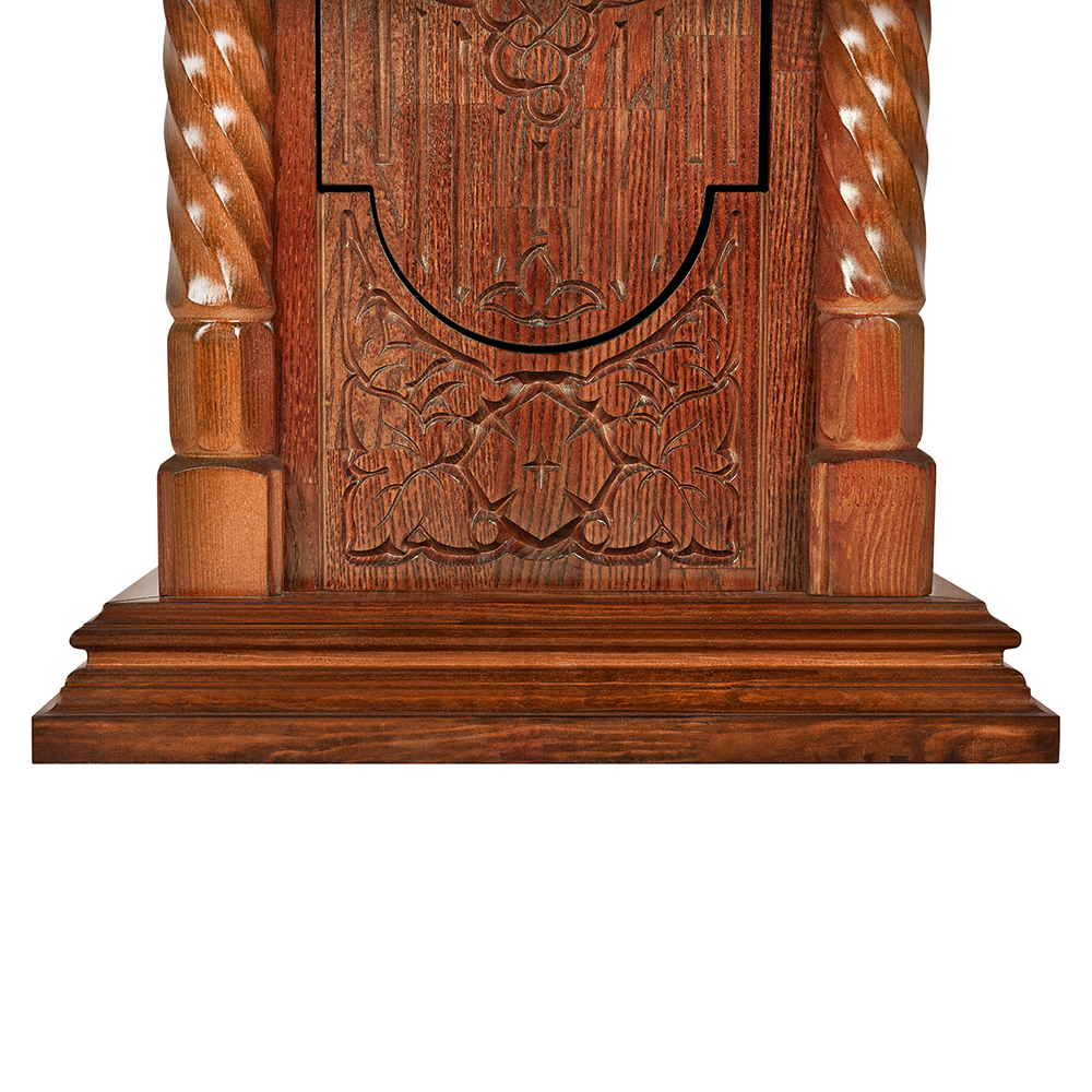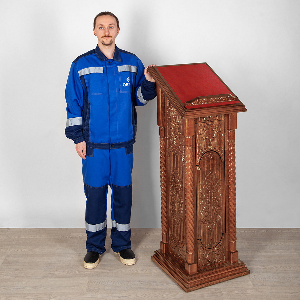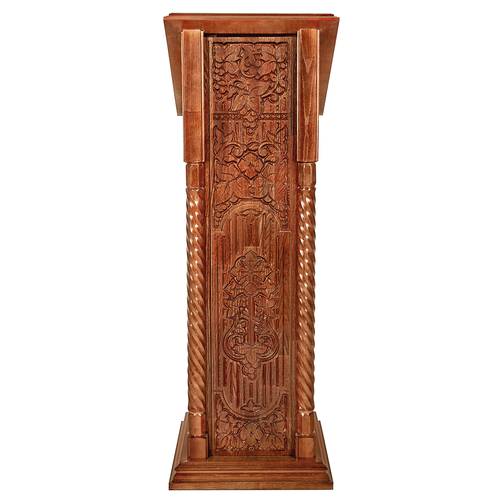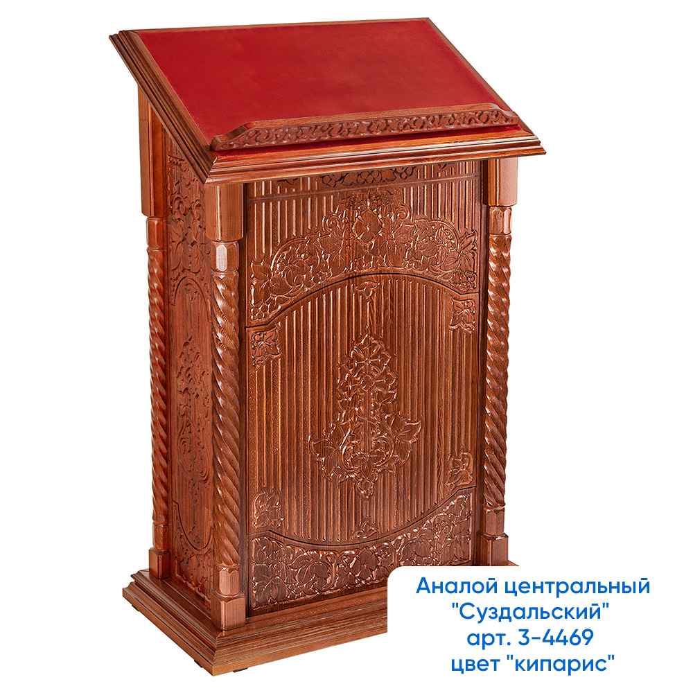 Боковой аналой из массива дерева с тонировкой под кипарис украсит интерьер храма в классическом или современном стиле. С четырех сторон корпуса методом рельефной резьбы нанесен орнамент "виноградная лоза", композицию дополняют витые колонны. Деревянная столешница расположена под небольшим углом и оснащена бортиком, препятствующим падению массивных аналойных икон. Возможно изготовление изделия с фигурной дверцей, внутреннее пространство за которой будет оснащено полкой для хранения богослужебных книг и дополнительных принадлежностей. Альтернативный вариант – модель с дверцей и вместительным ящиком.