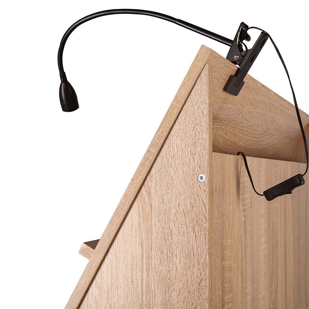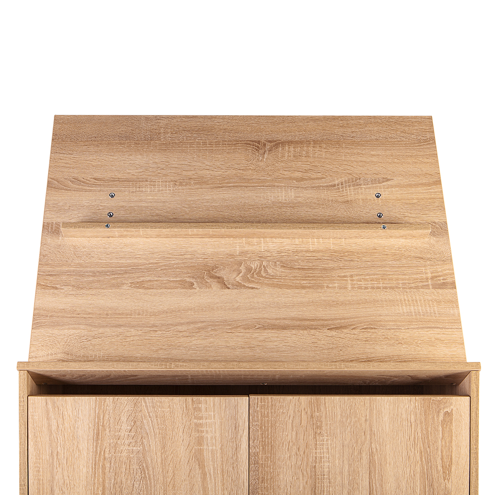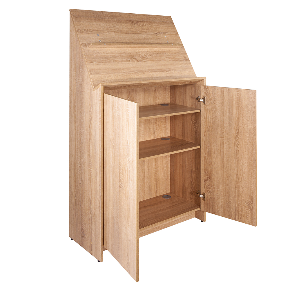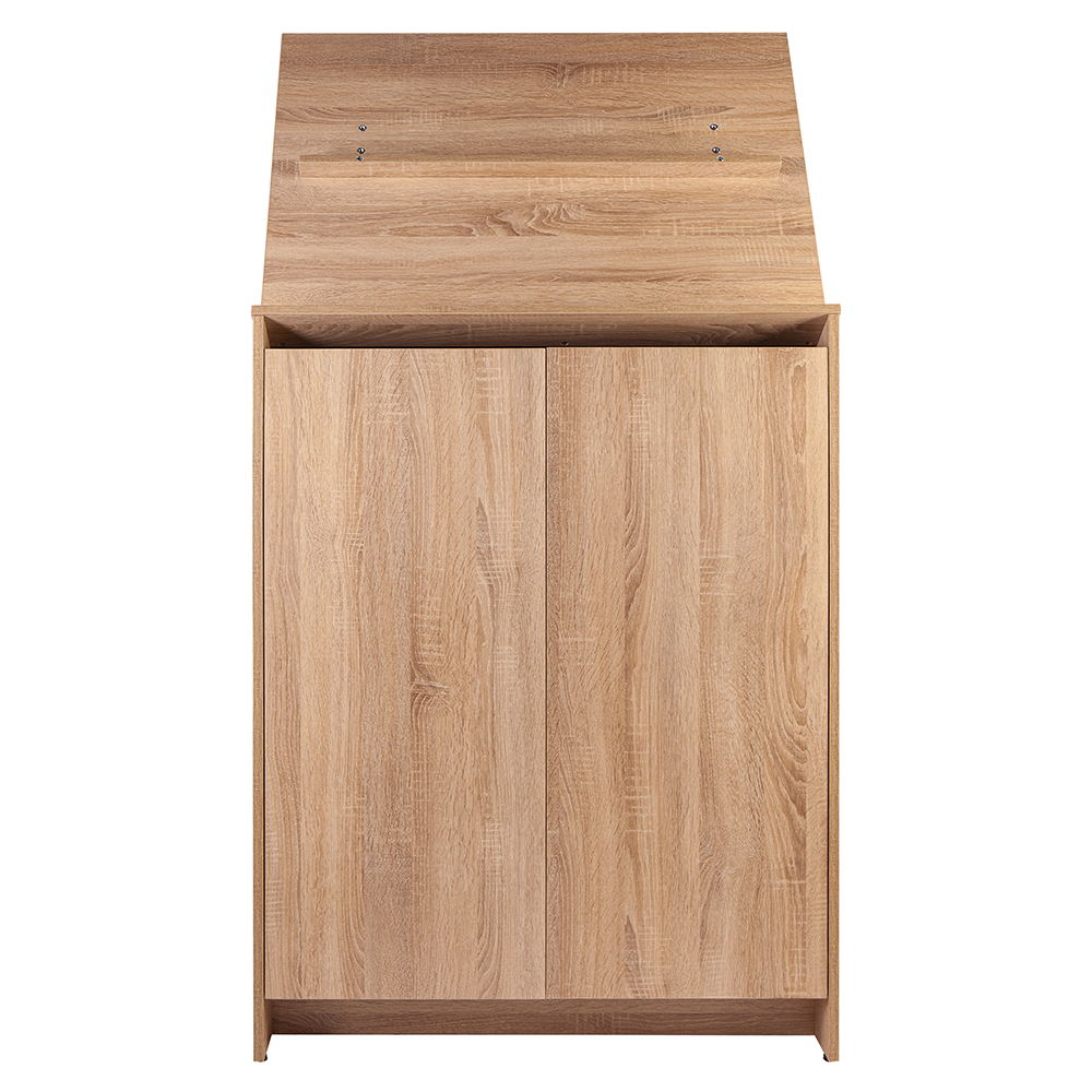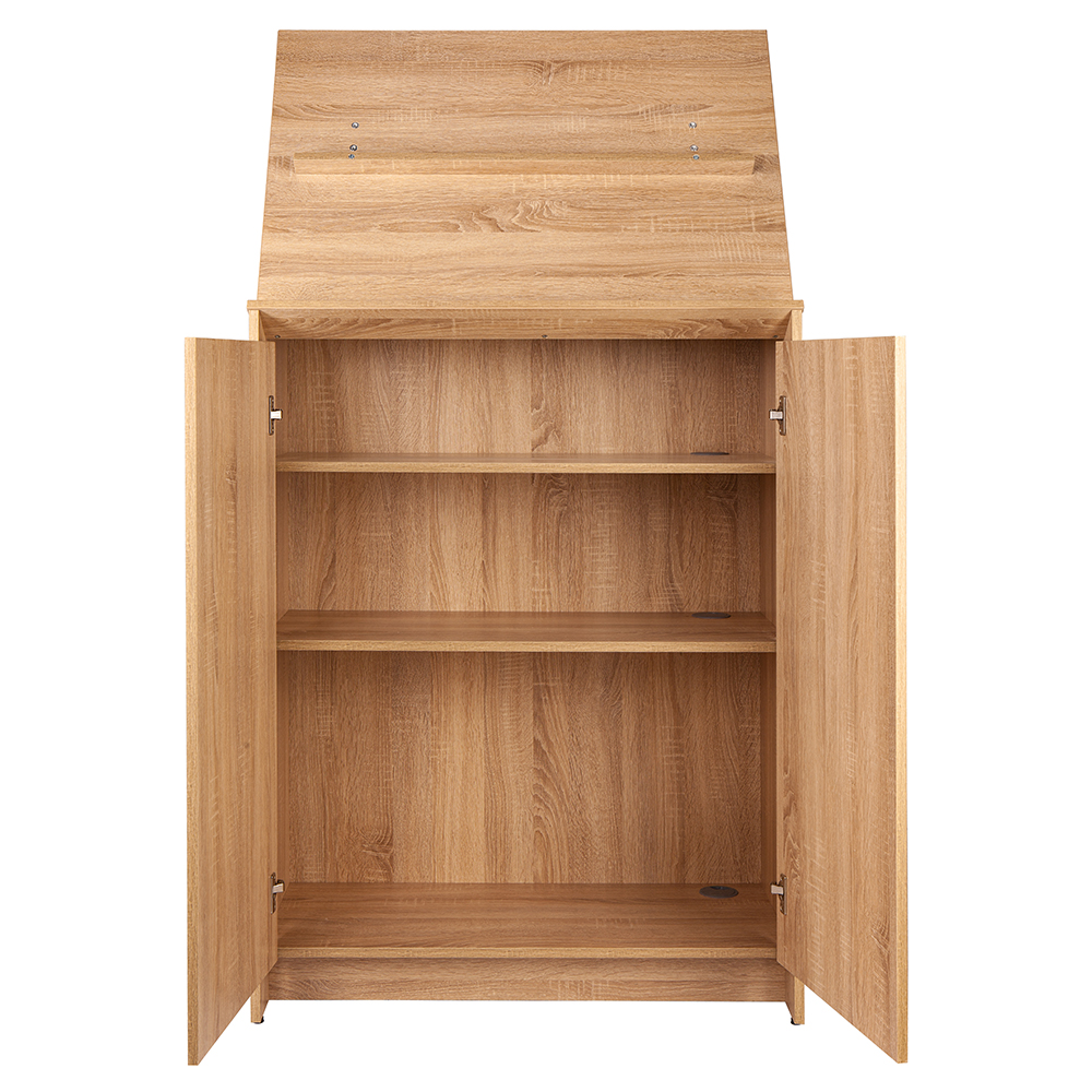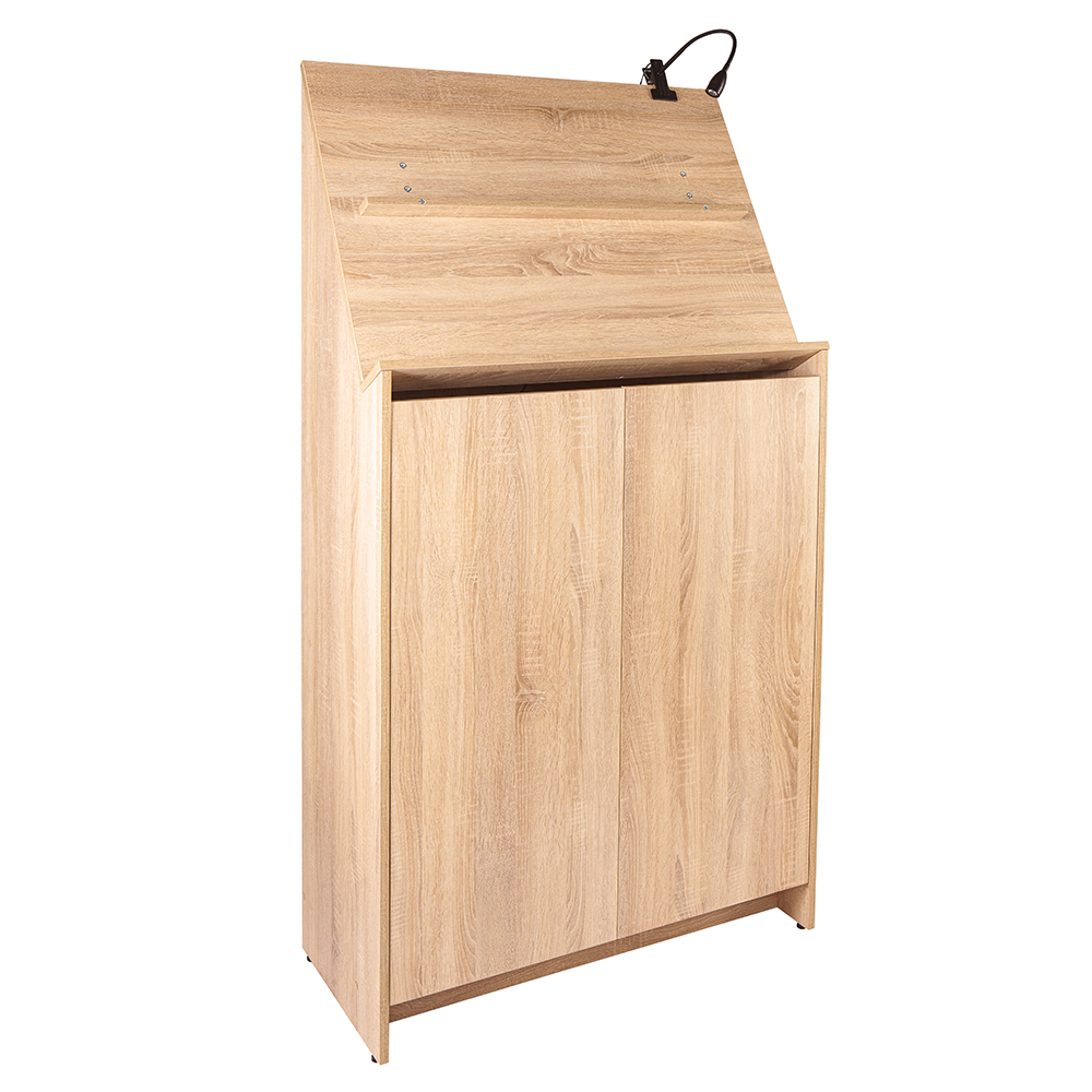 Клиросный аналой "Самарский" изготовлен из ЛДСП. Его основная часть - большой вместительный ящик для книг и нот, на которые опирается высокая наклонная столешница. При оформлении заказа покупатель может выбрать комплектацию - с дверцами или без них, а также цвет поверхности конструкции: ноче экко или дуб честерфильд.