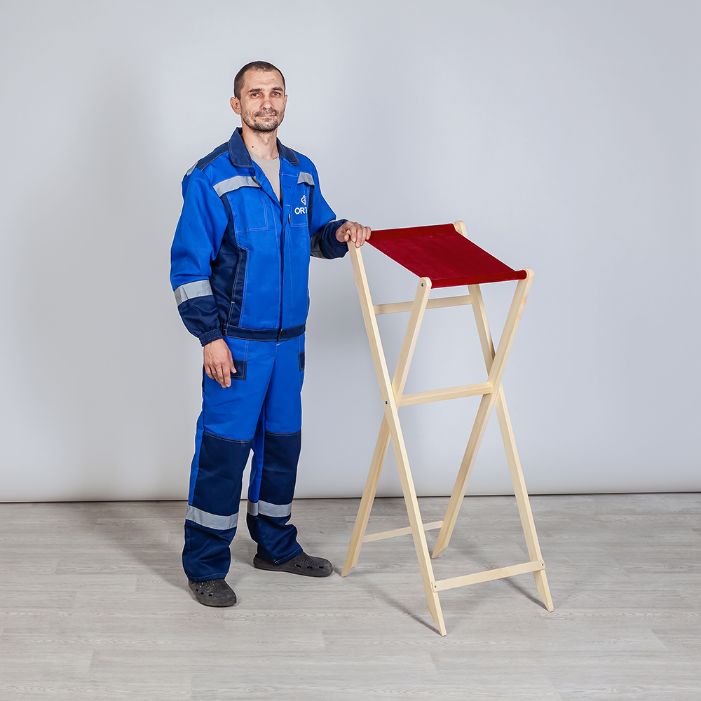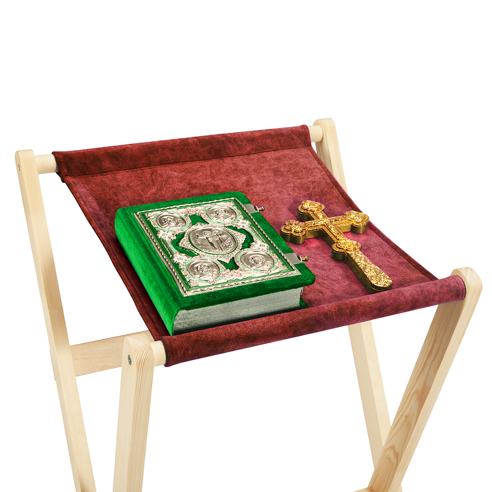 Раскладной аналой "Новгородский" изготовлен в виде устойчивой конструкции на подвижных ножках-опорах. Роль столешницы играет фрагмент плотной мебельной ткани, ее оттенок - красный. Конструкция представлена в трех вариантах оттенков - "кипарис", "натуральное дерево" и "белый".