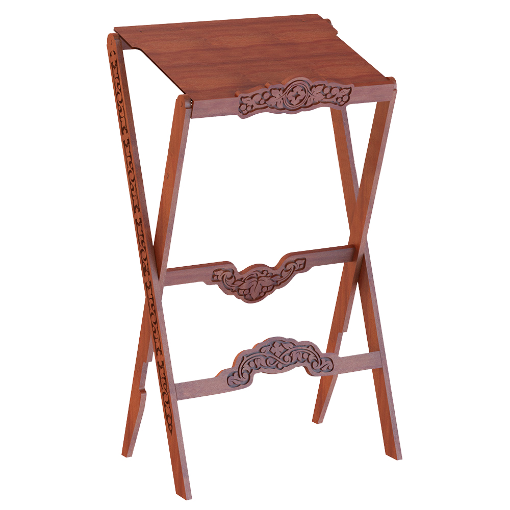 Раскладной аналой "Суздальский" изготовлен из массива сосны. Наклонная деревянная столешница оснащена полочкой, предохраняющей возлагаемые предметы от падения, а на верхней стороне столешницы имеется удобный выступ для крепления лампы или микрофона. Благодаря оригинальной складной конструкции аналой легок и устойчив одновременно. Детали изделия декорированы резным орнаментом "виноградная лоза" и четырехконечными крестами.