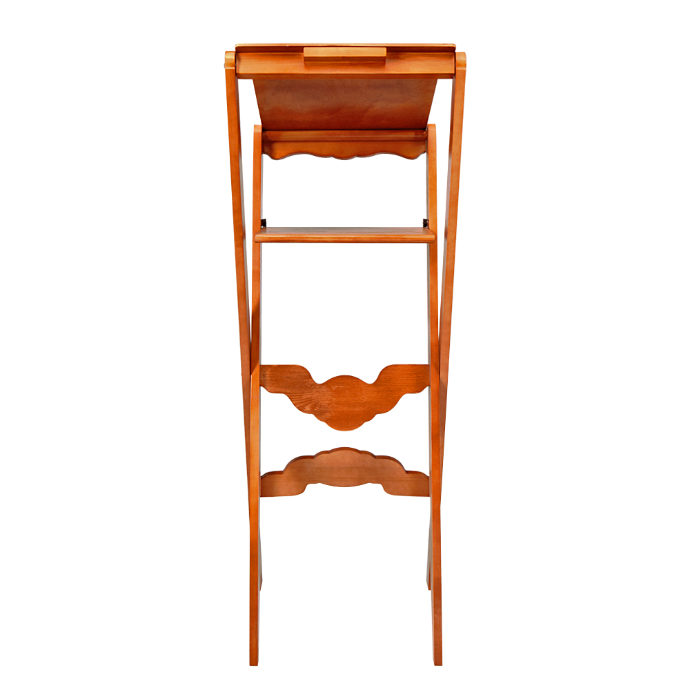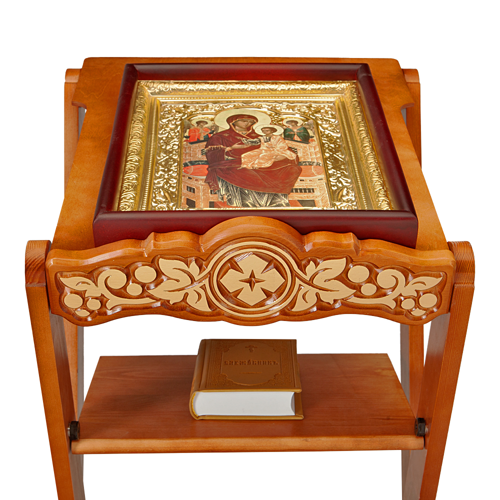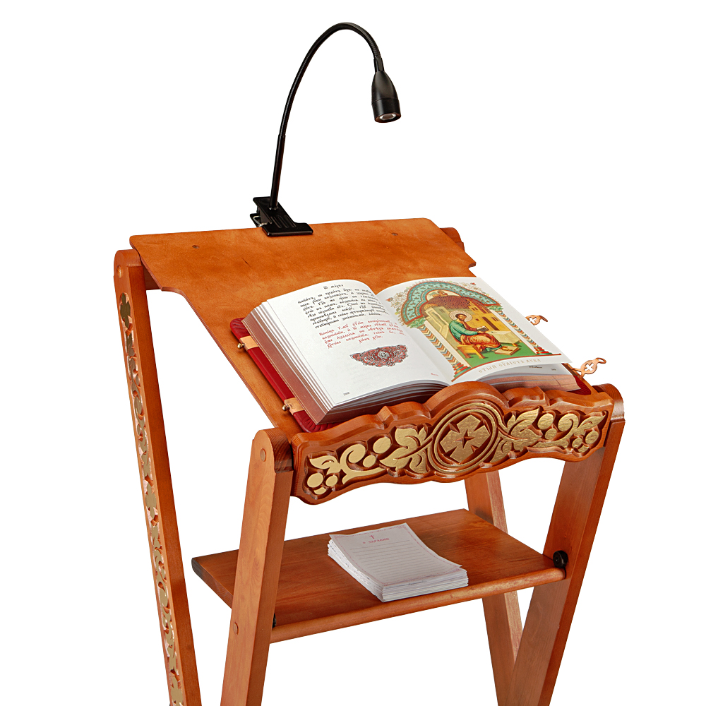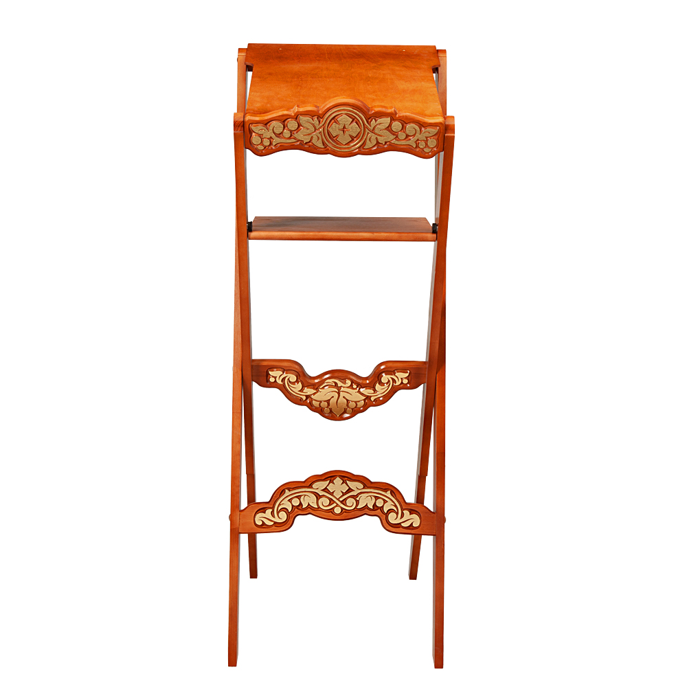 Раскладной деревянный аналой "Суздальский" с деревянной столешницей и полкой лаконичен и удобен в применении.