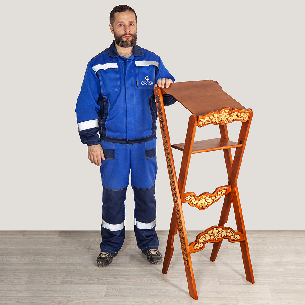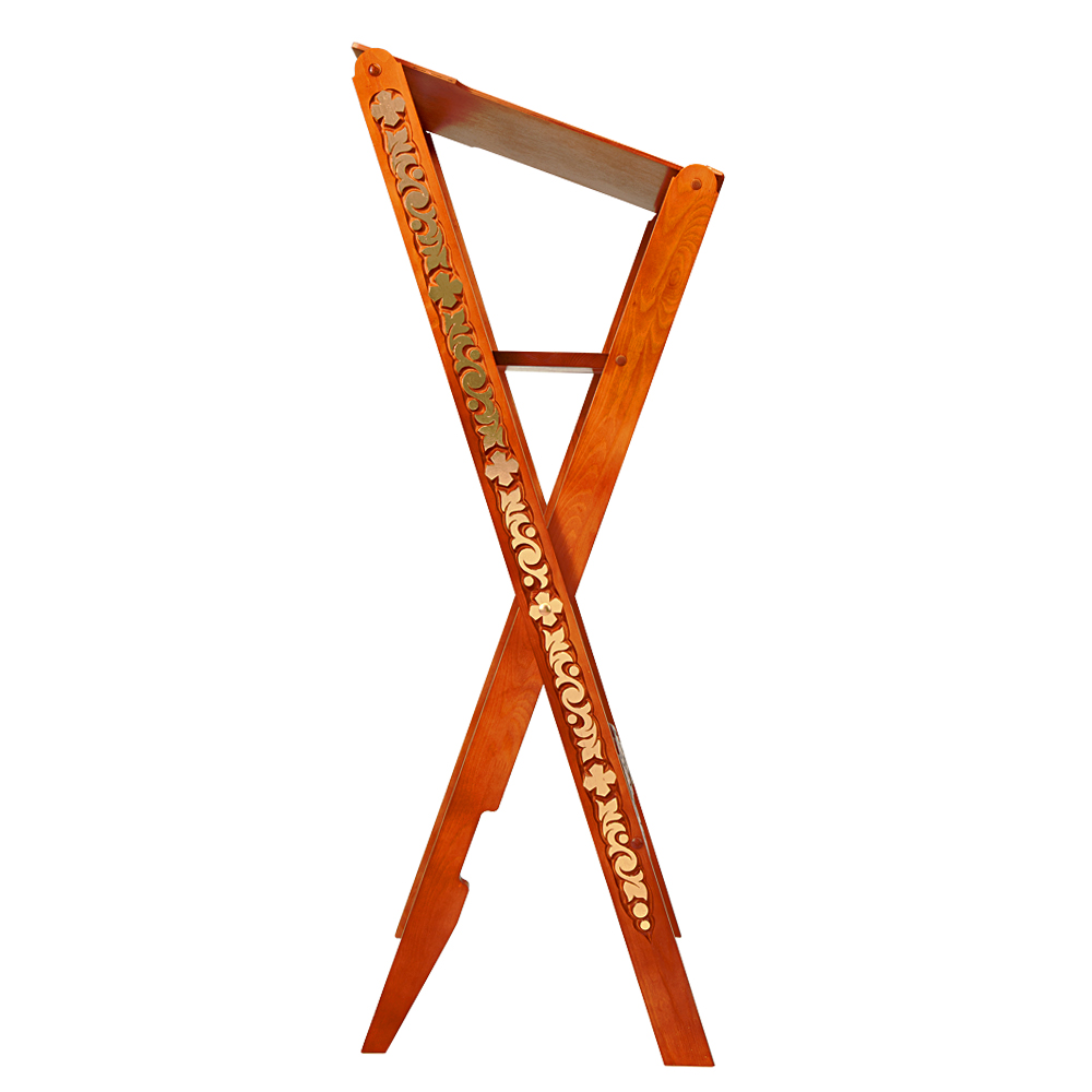 Раскладной аналой "Суздальский" изготовлен из дерева. Наклонная деревянная столешница оснащена полочкой, предохраняющей возлагаемые предметы от падения, а на верхней стороне столешницы имеется удобный выступ для крепления лампы или микрофона. Откидная полка под столешницей может быть использована для хранения книг и других богослужебных принадлежностей. Благодаря оригинальной складной конструкции аналой легок и устойчив одновременно. Детали изделия декорированы резным орнаментом "виноградная лоза" и четырехконечными крестами.