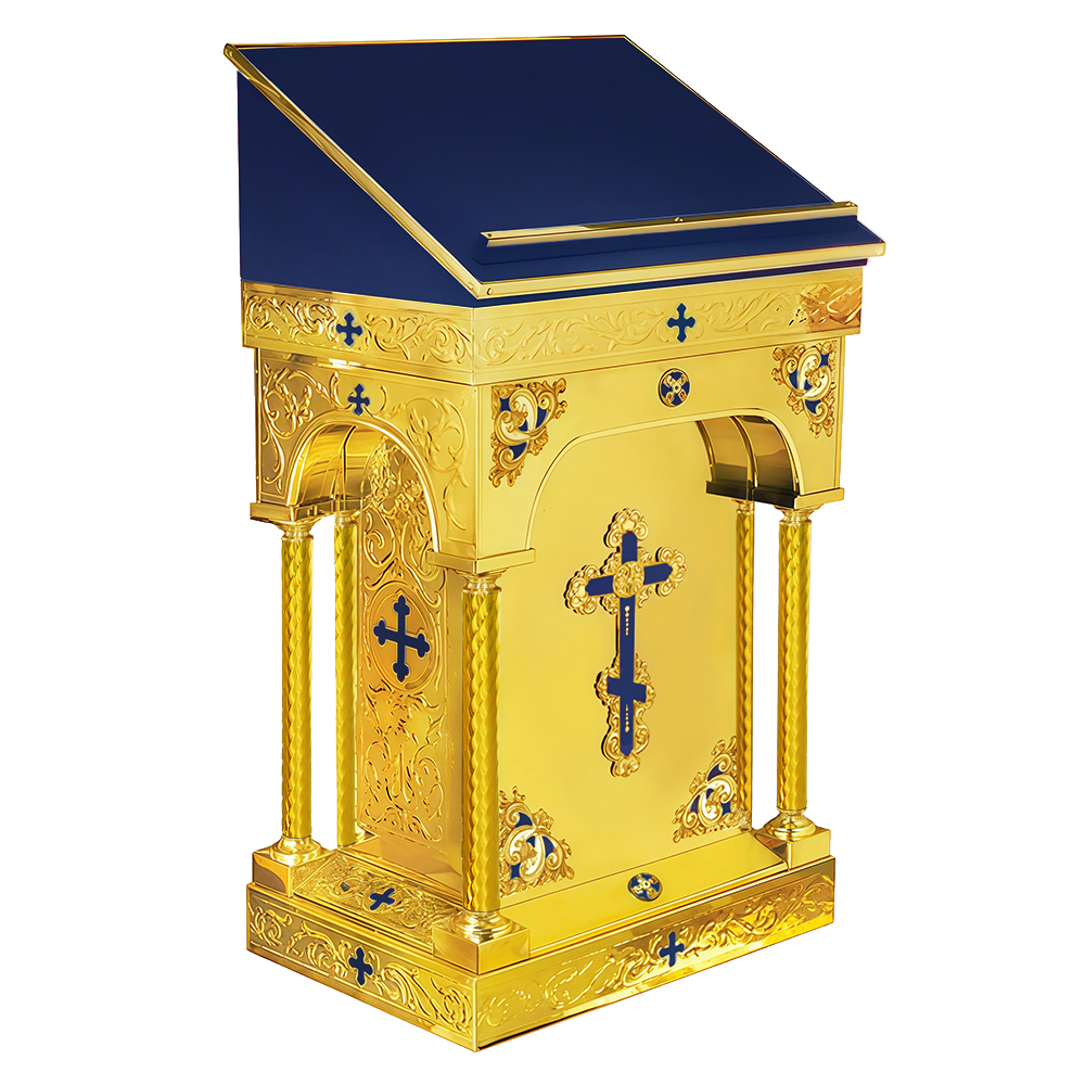 Роскошный металлический центральный аналой выполнен из высококачественной нержавеющей стали с напылением нитрида титана, устойчивым к коррозии и различным внешним воздействиям. Верхняя часть изделия представляет собой наклонную поверхность, покрытую тканью с аккуратной полочкой. Изделие выглядит величественно благодаря своей необычной конструкции. Вокруг центральной части аналоя расположены изящные витые ножки с арками, снизу дополненные массивной подставкой. Со всех сторон предмет украшен чеканкой в виде растительного орнамента, объемными декоративными элементами и накладками в виде крестов, покрытых эмалью. Этот аналой подойдет как для больших соборов с пышным убранством, так и для приходских храмов.