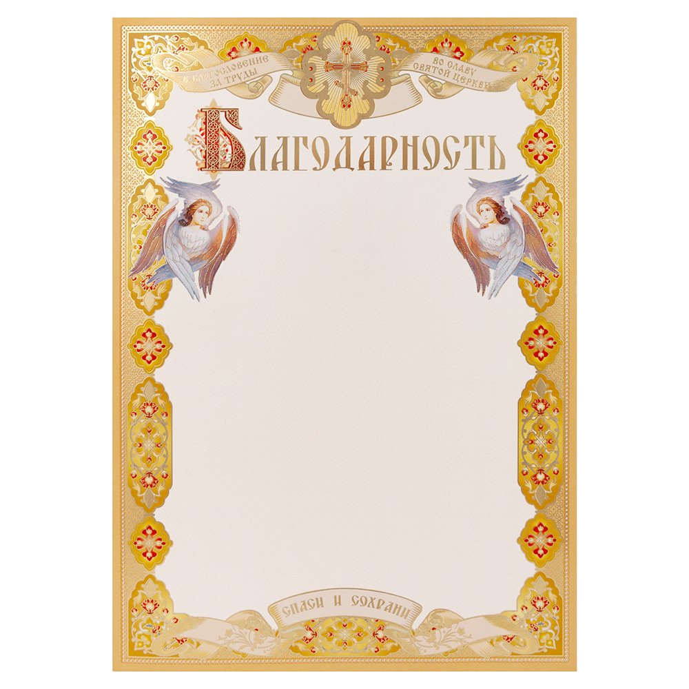 Бланк предназначен для благодарственных писем. Он изготовлен из мелованного картона. Бланк украшен изображениями креста, херувимов, надписью "Спаси и сохрани" и орнаментом.