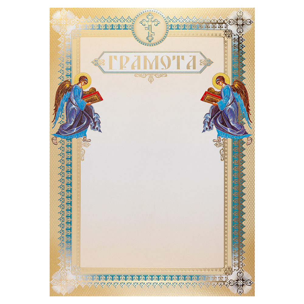 Бланк предназначен для православных грамот. Он изготовлен из мелованного картона. Бланк украшен изображениями креста, ангелов и орнаментом.