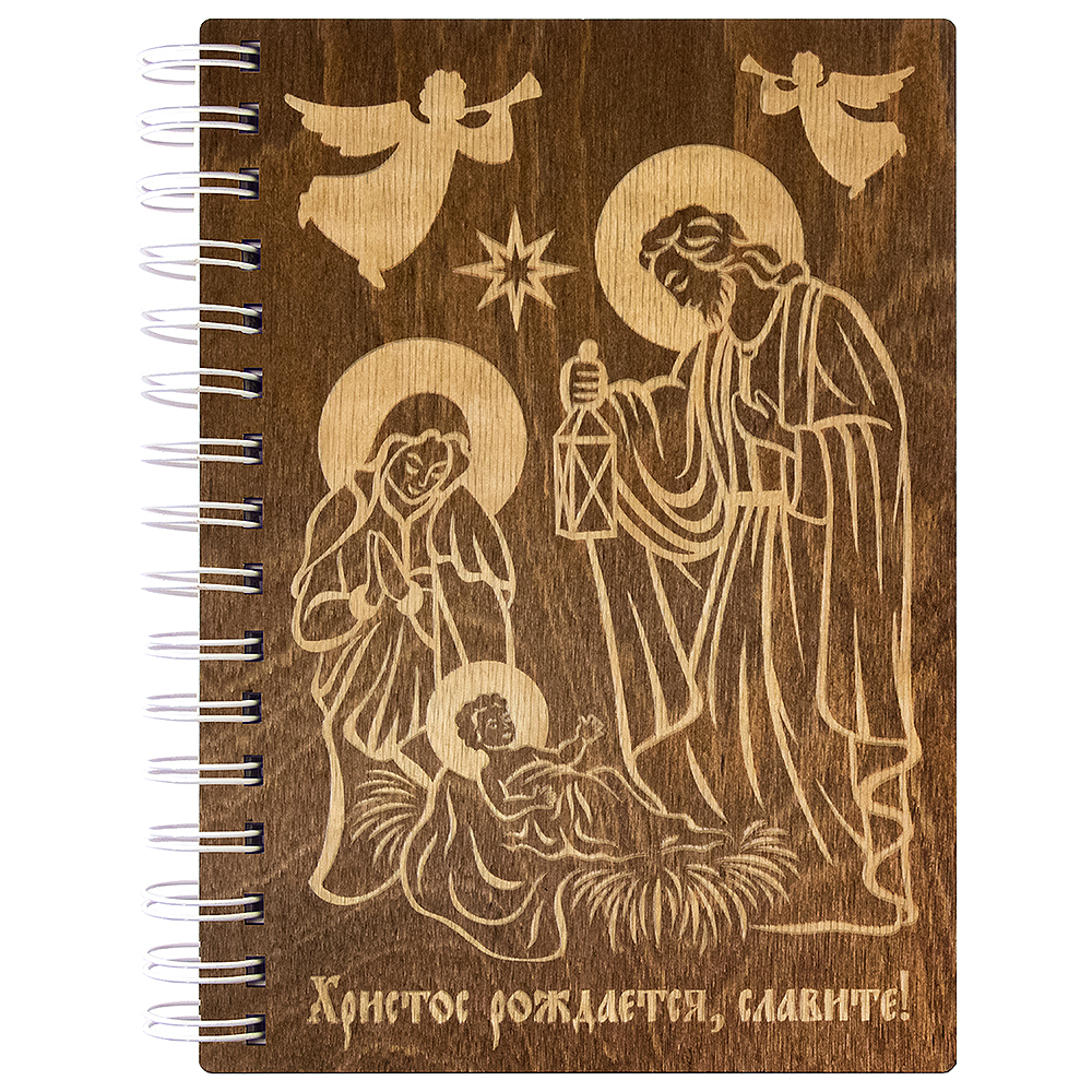 Блокнот с деревянной обложкой "Христос рождается, славите!" на пружине.
