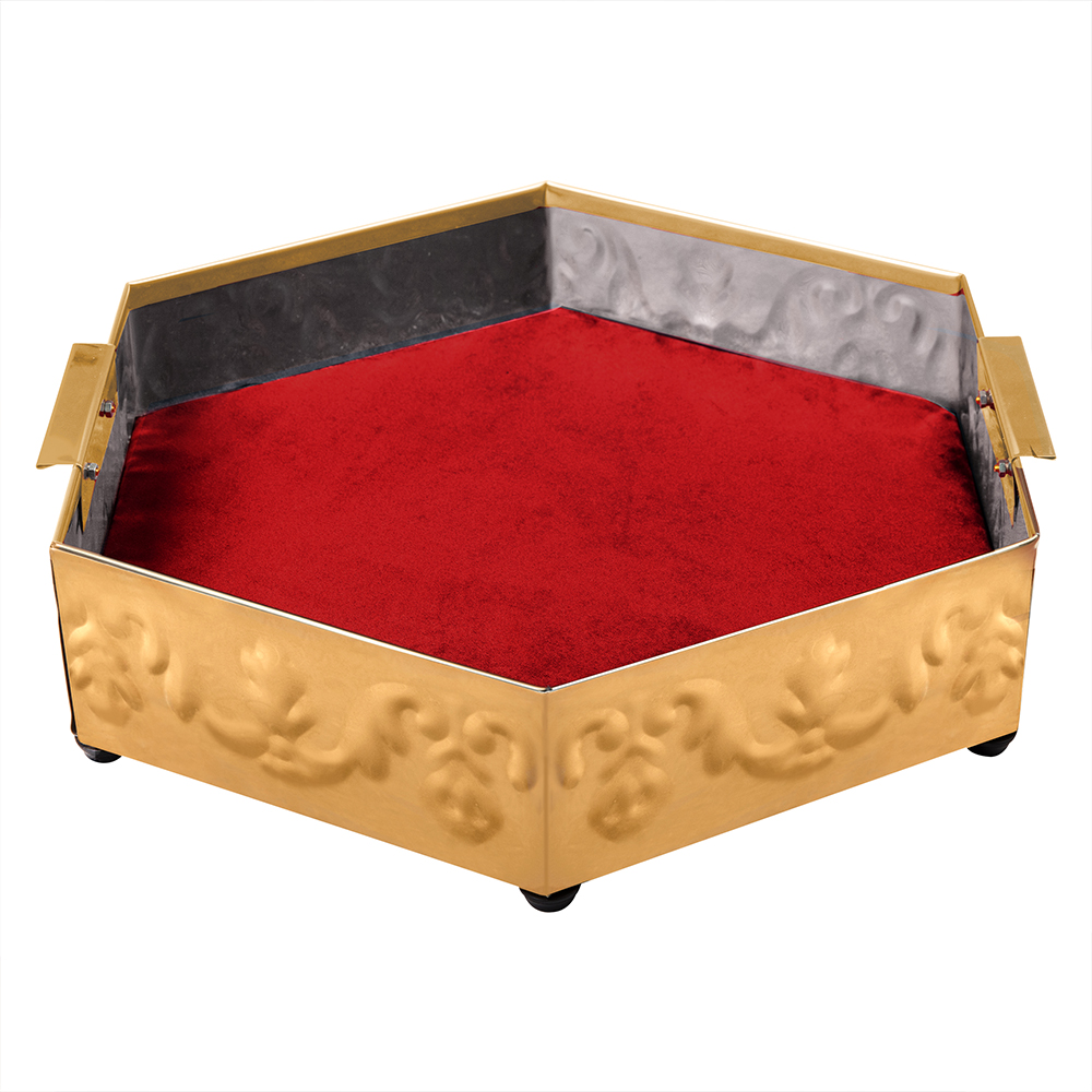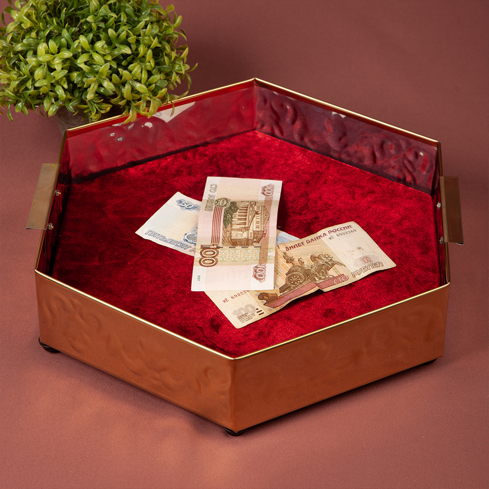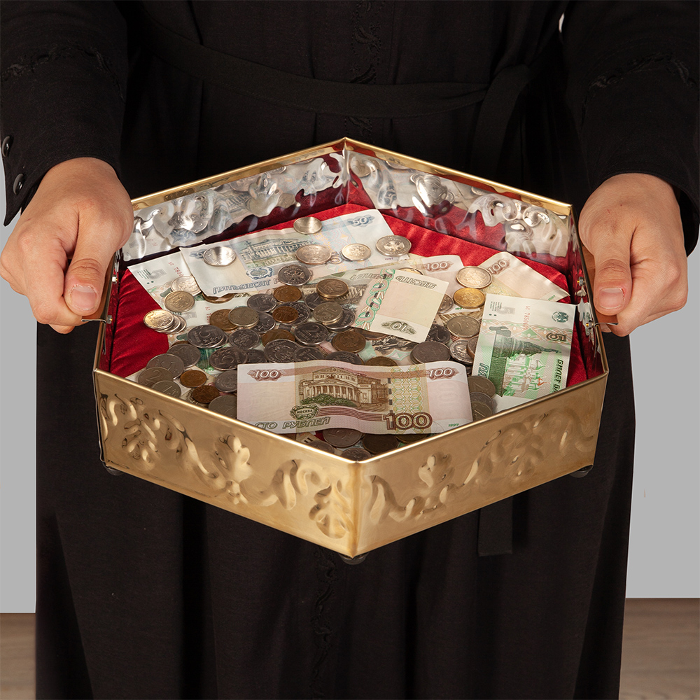 Блюдо для пожертвований оригинальной шестигранной формы изготовлено из нержавеющей стали с напылением нитрида титана для защиты сплава и придания ему привлекательного внешнего вида. Внутренняя поверхность закрыта слоем плотной мебельной ткани. Ее желаемый цвет нужно указать при оформлении заказа, выбрав любой из доступных вариантов. Высокие бортики увеличивают вместительность ящика, а орнамент на стенках придает ему привлекательный вид.
