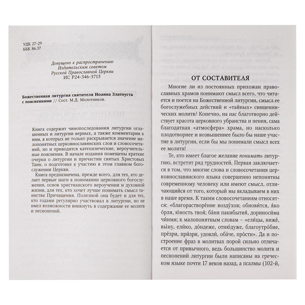"Божественная литургия святителя Иоанна Златоуста с пояснениями" — книга для тех, кто желает разобраться в особенностях православного богослужения. В ней представлены чинопоследования литургии оглашенных и литургии верных, а также подробные комментарии, которые передают значение непонятных терминов и раскрывают глубокий духовный смысл происходящего в алтаре и в храме. Особенно ценны вероучительные разъяснения, позволяющие понять суть священнодействий и их место в деле спасения человека. В начале книги рассказывается о Божественной литургии и Таинстве Евхаристии, а также о правилах подготовки к участию в них для верных членов Церкви.