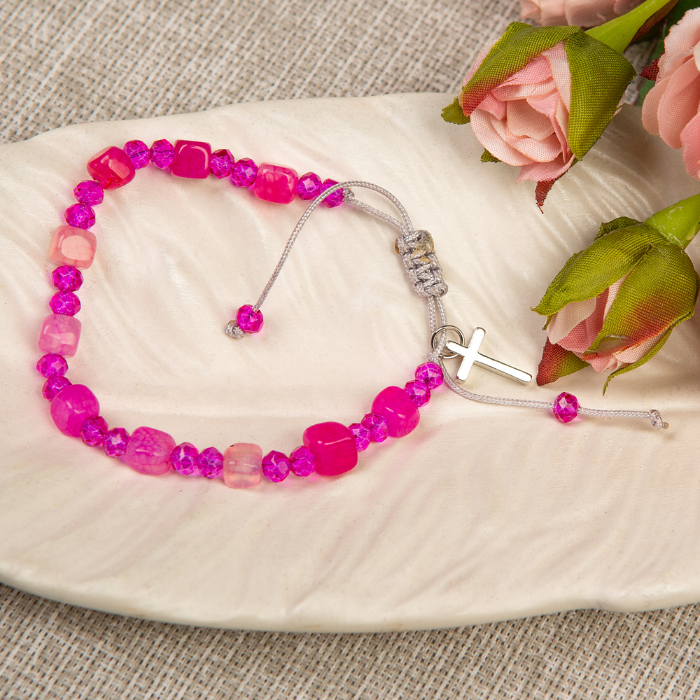 Браслет из камня (агат) с металлическим крестиком, регулируемый размер