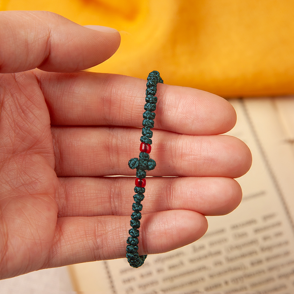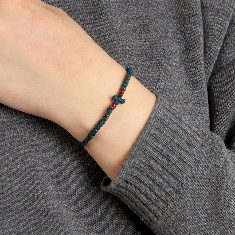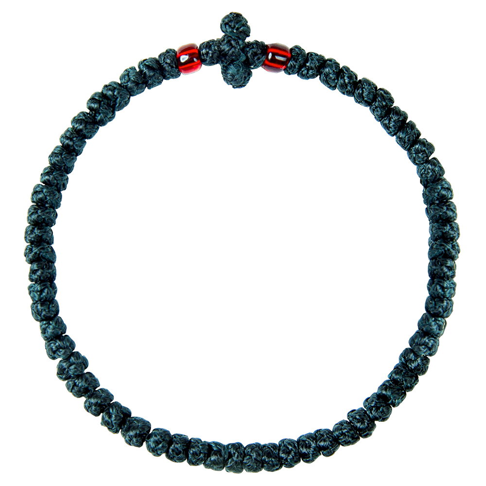 Комбоскини – греческие четки, в переводе – веревка из узлов: комбос - узел, скини – веревка. Браслет связан из прочной цветной нити в виде ряда плотных узелков и украшен бусинами, обрамляющими плетеный равносторонний крест. Согласно традиции комбоскини носится на левой руке и используется при чтении молитвенного правила как четки.