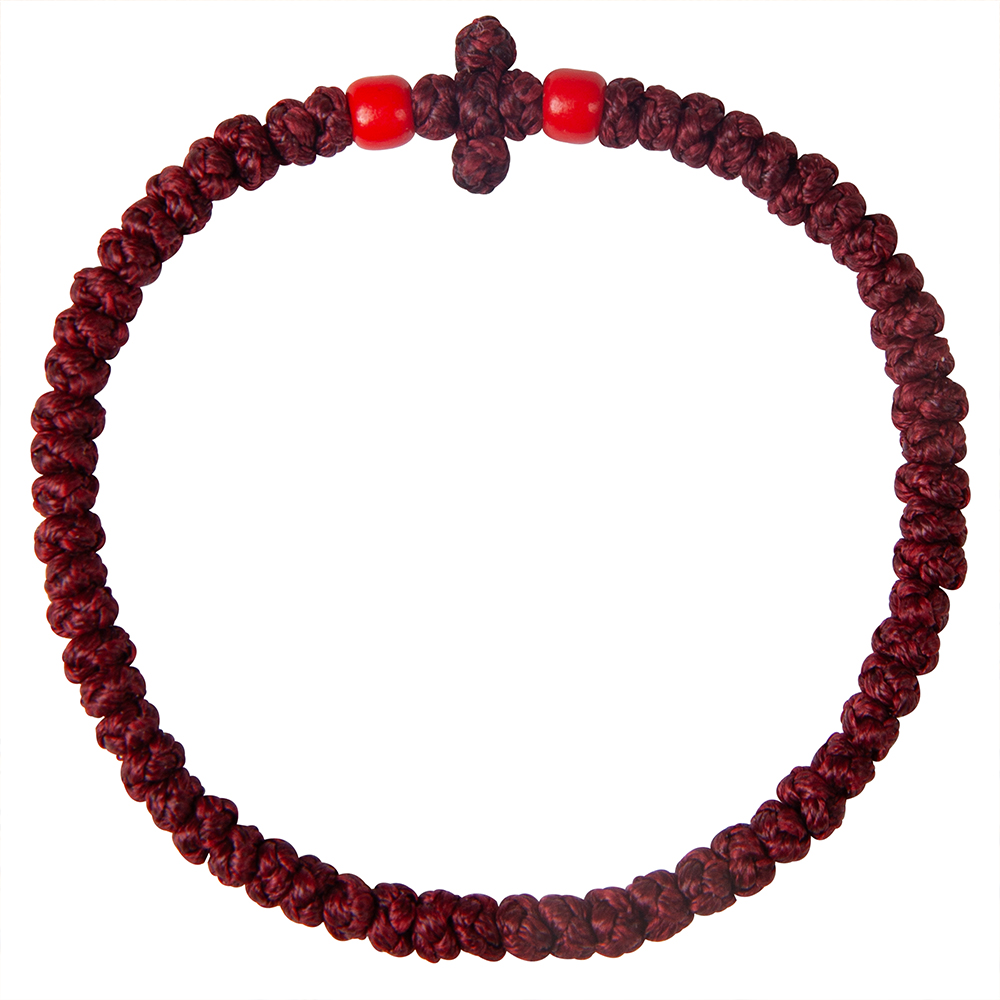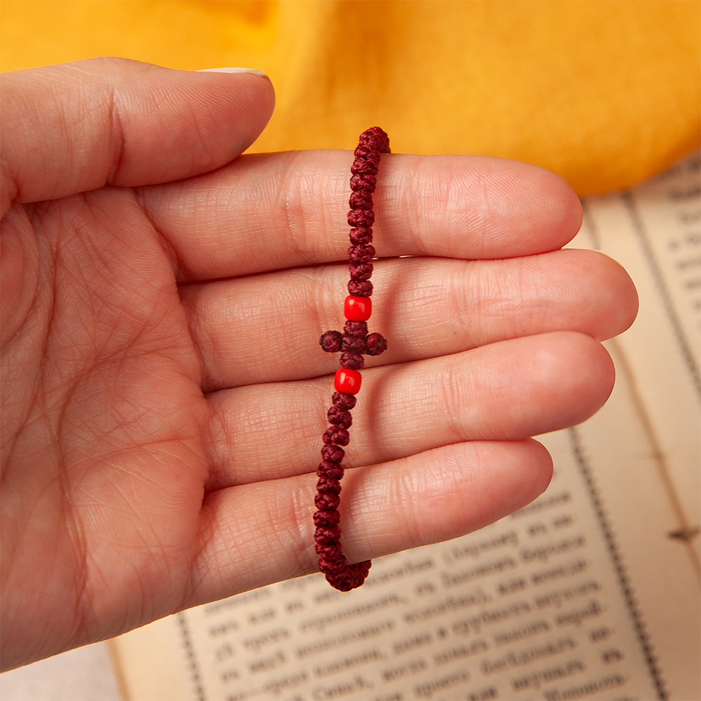 Комбоскини – греческие четки, в переводе – веревка из узлов: комбос - узел, скини – веревка. Браслет связан из прочной цветной нити в виде ряда плотных узелков и украшен бусинами, обрамляющими плетеный равносторонний крест. Согласно традиции комбоскини носится на левой руке и используется при чтении молитвенного правила как четки.