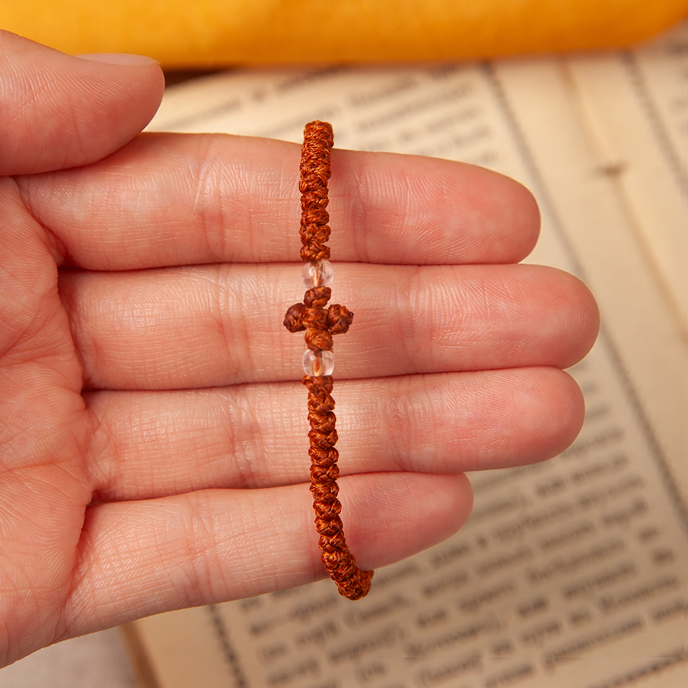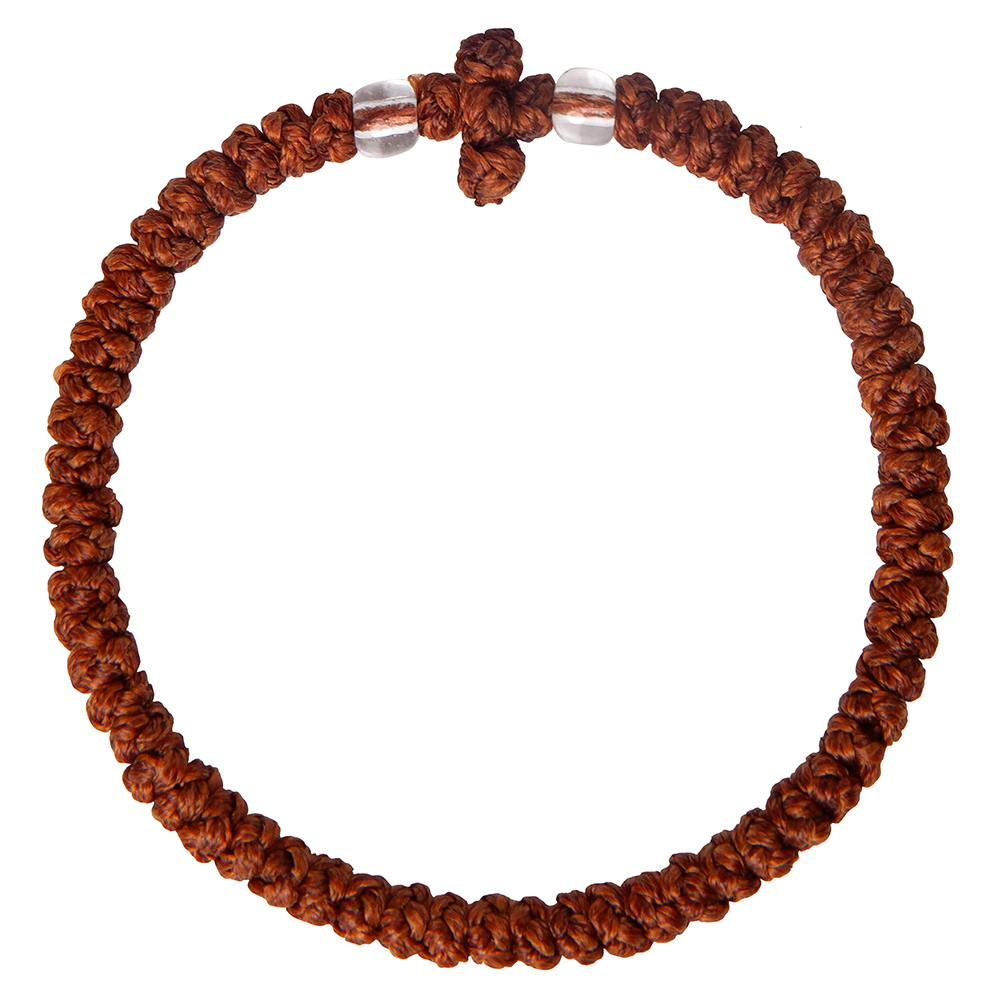 Комбоскини – греческие четки, в переводе – веревка из узлов: комбос - узел, скини – веревка. Браслет связан из прочной цветной нити в виде ряда плотных узелков и украшен бусинами, обрамляющими плетеный равносторонний крест. Согласно традиции комбоскини носится на левой руке и используется при чтении молитвенного правила как четки.