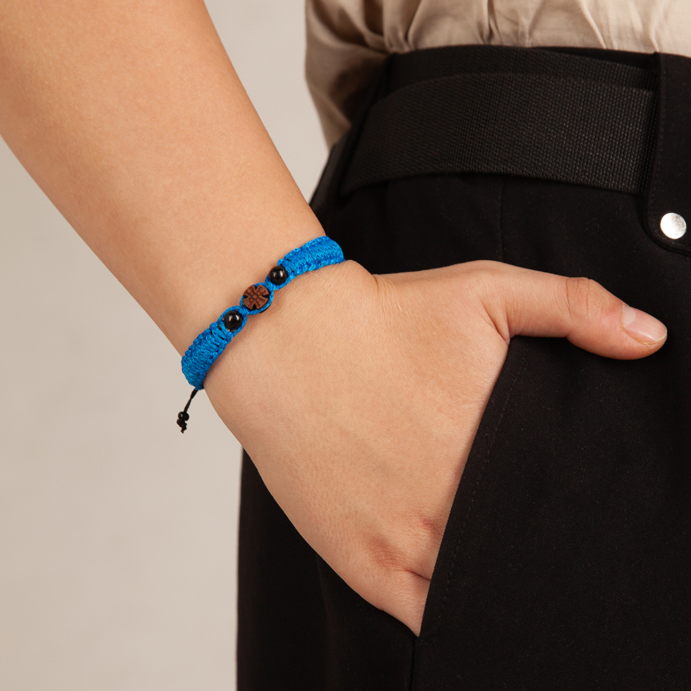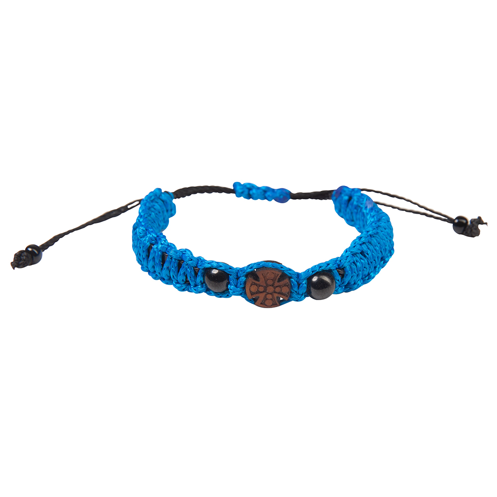 Яркий браслет сплетен из прочной витой нити и украшен равносторонним крестом с двумя бусинами контрастного цвета. Регулируемая длина позволит удобно посадить украшение на запястье. Практичное и прочное изделие подойдет для постоянного ношения ребенком или подростком, а также станет хорошим подарком паломнику.