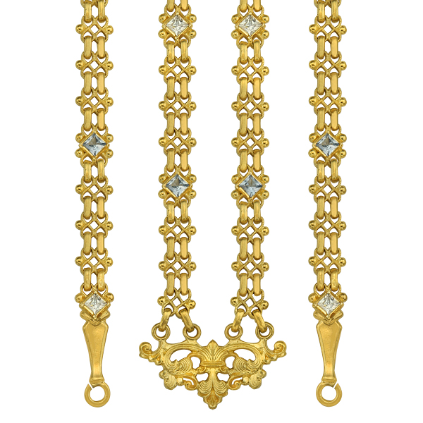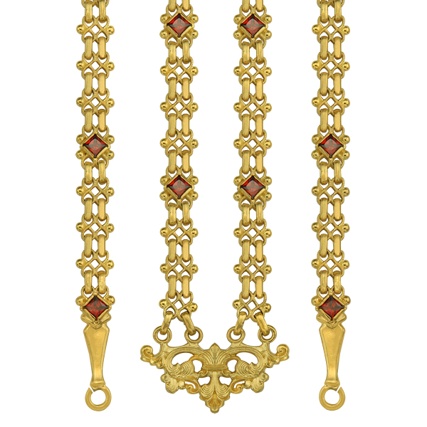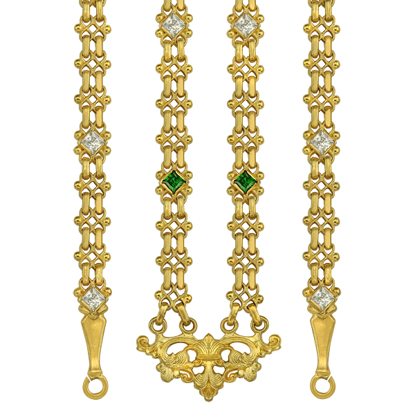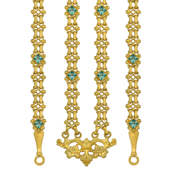 Цепь для наперсных крестов и панагий изготовлена из высококачественного ювелирного сплава. Покрытие позолотой придает изделию привлекательный блеск. В качестве дополнительного украшения звеньев использованы вставки с цветными фианитами.