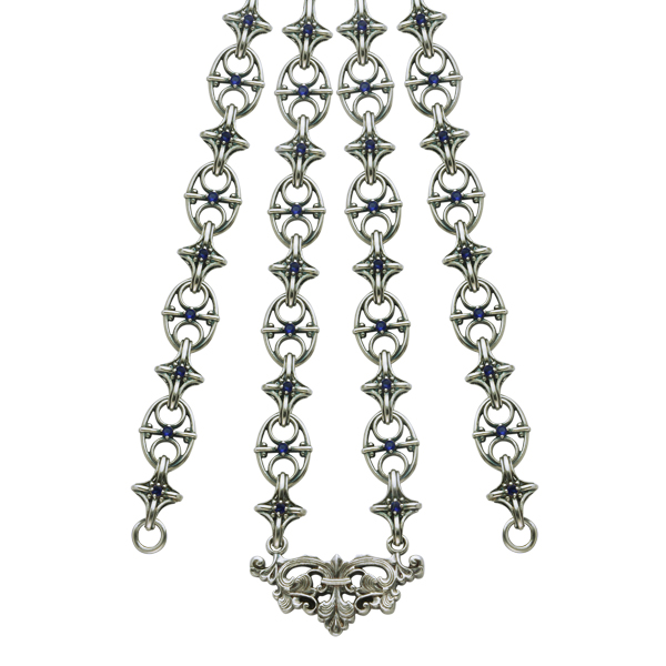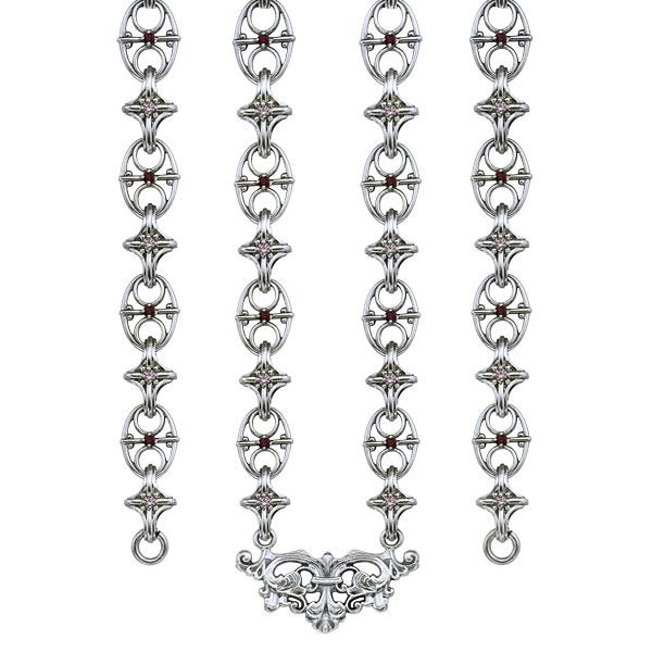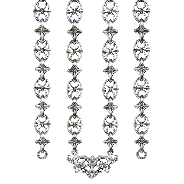 Цепь для наперсных крестов и панагий изготовлена из серебра. Звенья необычной овальной и звездчатой формы, из которых собрана цепь, украшены вставками с цветными фианитами.