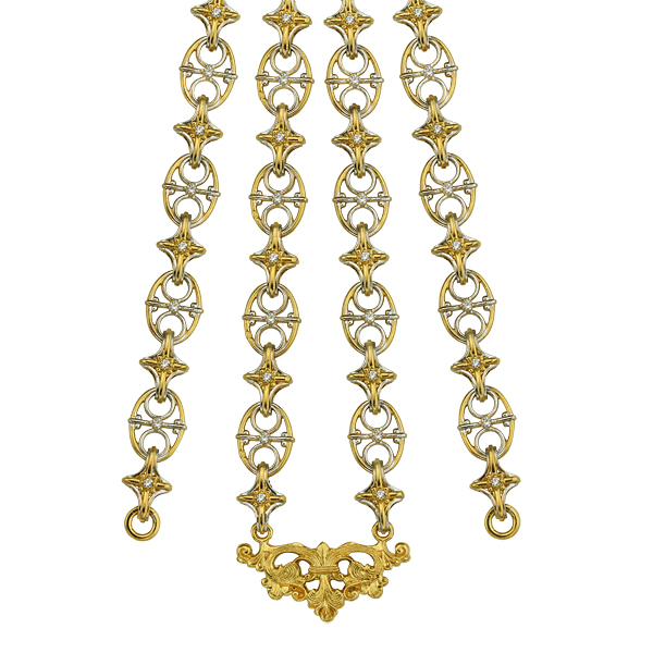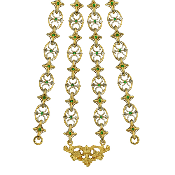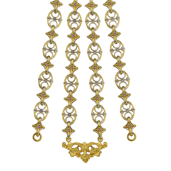 Цепь для наперсных крестов и панагий изготовлена из серебра. Позолоченное покрытие придает изделию особую декоративность и красивый блеск. Звенья необычной овальной и звездчатой формы, из которых собрана цепь, украшены вставками с цветными фианитами.