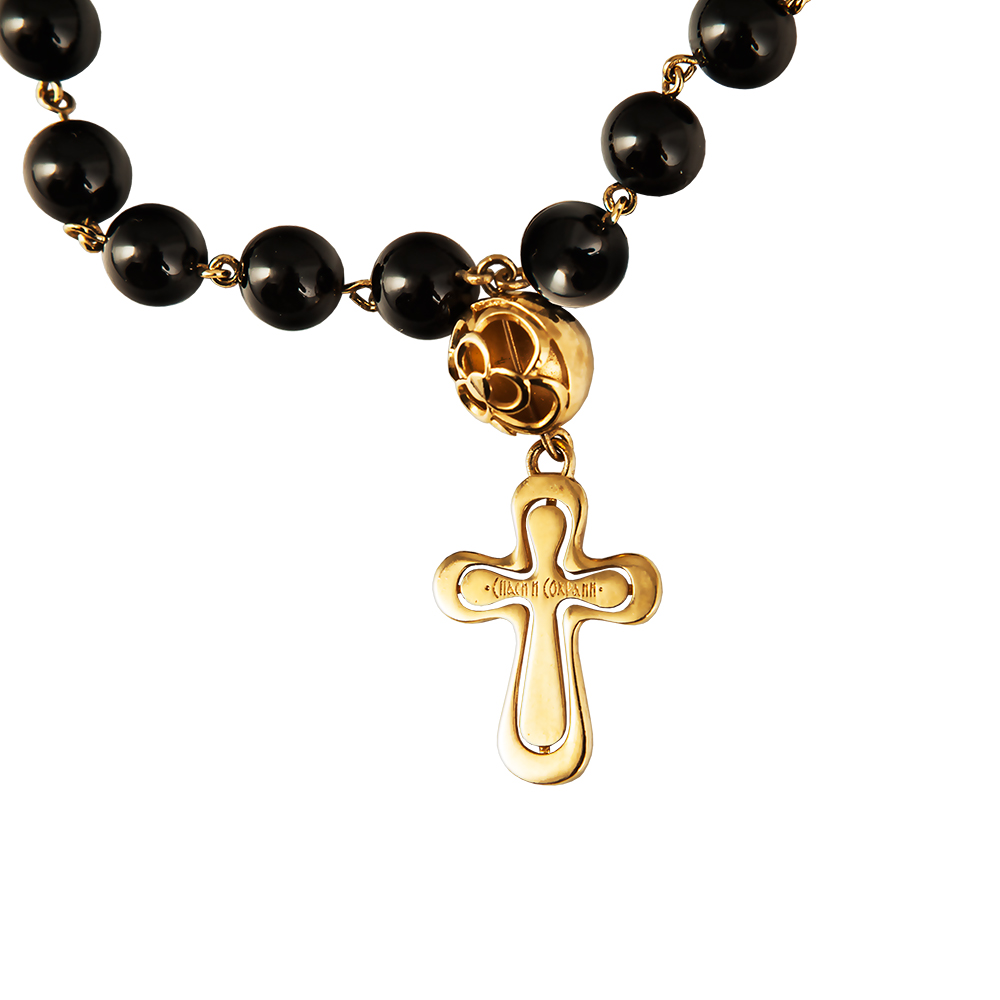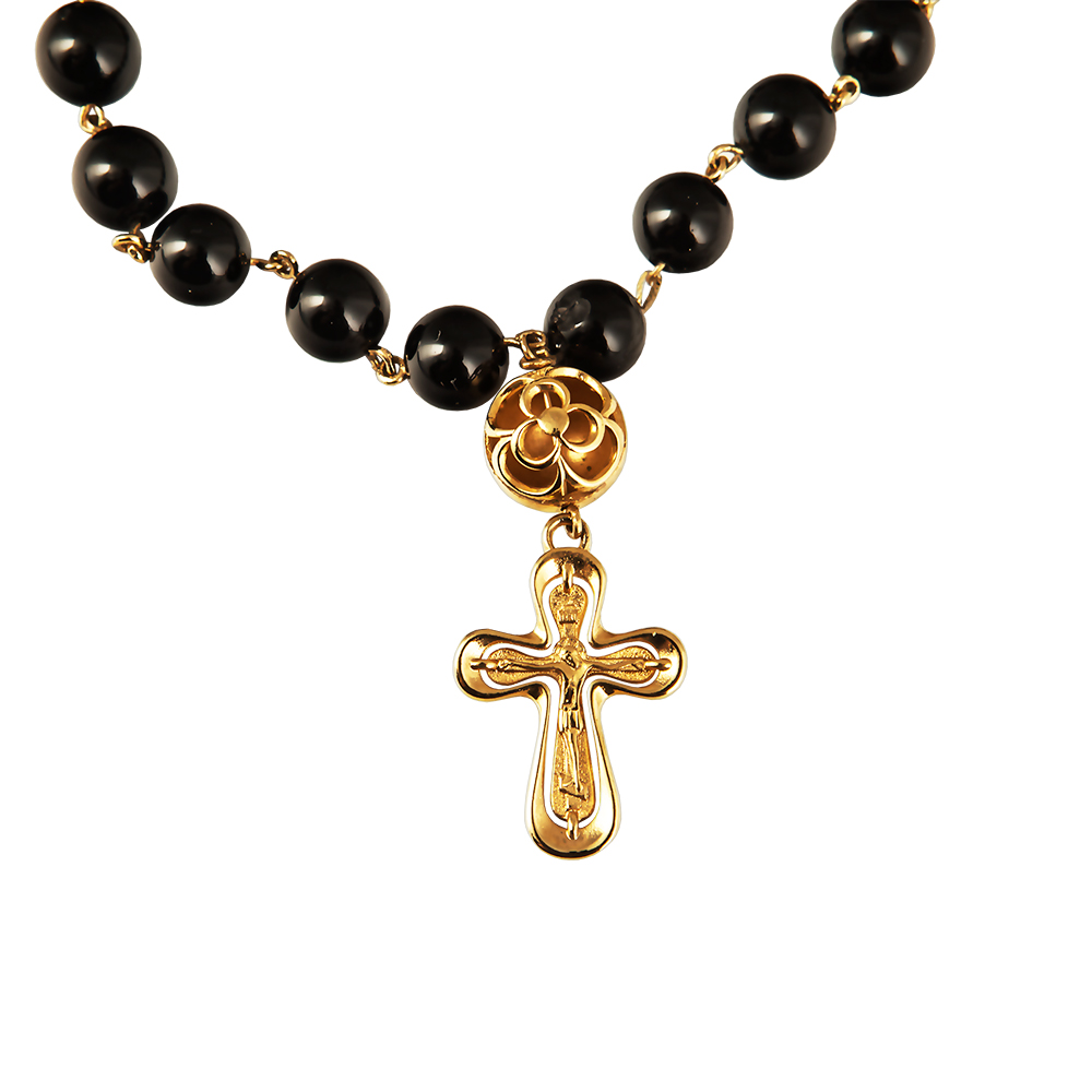 Четки на 40 бусин изготовлены из оникса. Десятичные бусины и подвеска крест выполнены из ювелирного сплава, они покрыты качественной позолотой. Такая технология нанесения гарантирует неизменный вид изделия на очень длительный срок. Все бусины надежно закреплены между собой посредством крючков из ювелирного сплава, пропаянных вручную. По желанию покупателя четки могут быть упакованы в презентабельную кожвиниловую упаковку с бархатным ложементом.