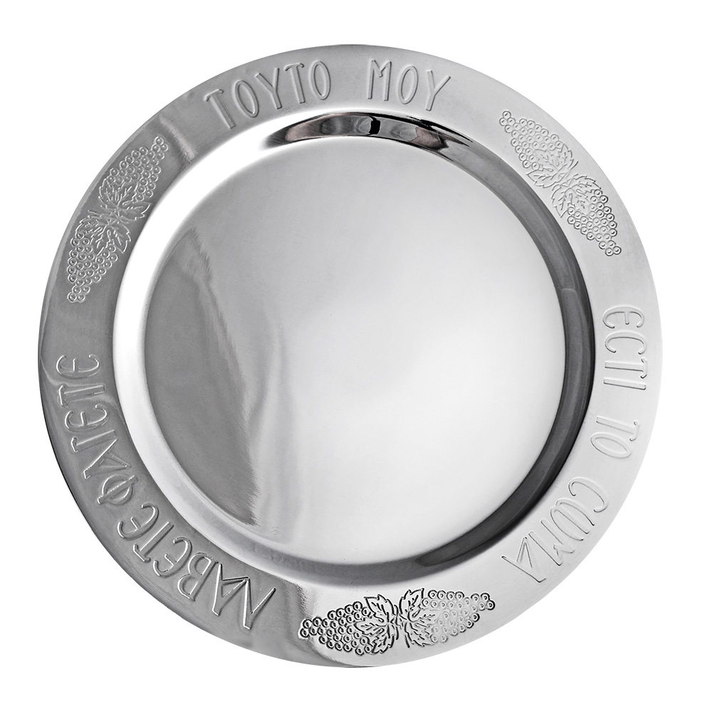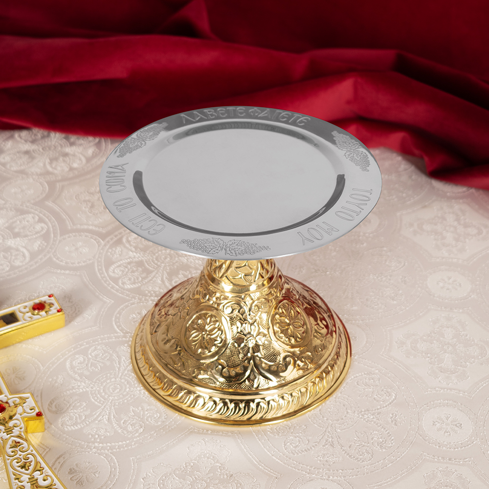 Материал: нижняя часть дискоса - латунь, тарель - нержавеющая сталь.
