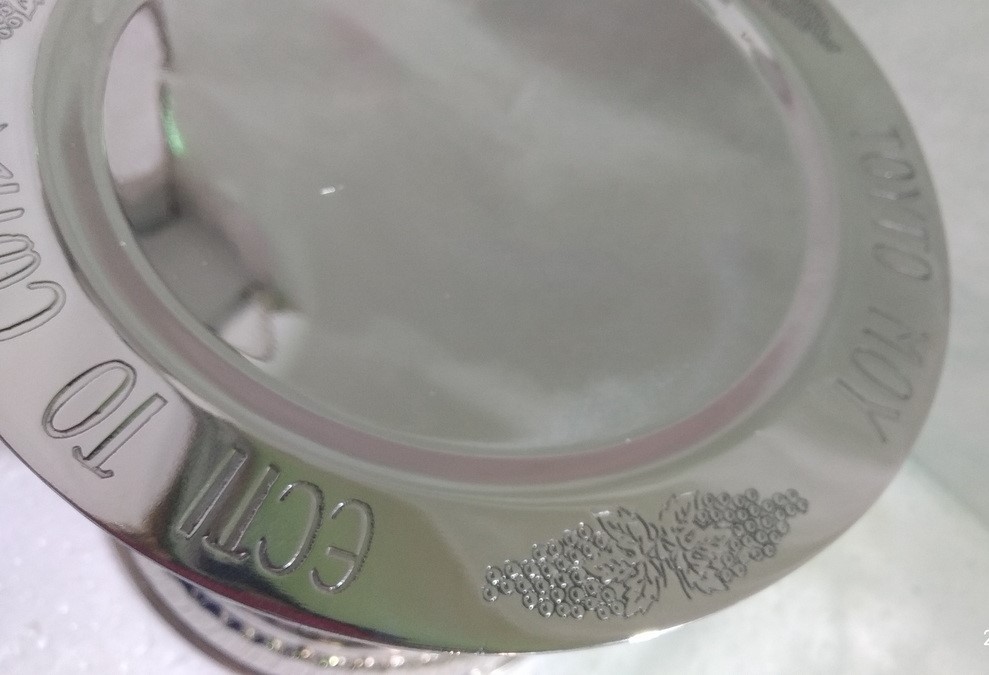 Дискос изготовлен из двух видов сплавов. Нижняя часть выполнена из латуни, тарель – из нержавеющей стали. Изделие украшает декоративный орнамент, нанесенный на поверхность широкого основания конусообразной формы. Защитное покрытие по технологии никелирования придает изделию сдержанный внешний вид и привлекательный блеск. Изображения и надписи на поверхности тарели выполнены по технологии гравировки.