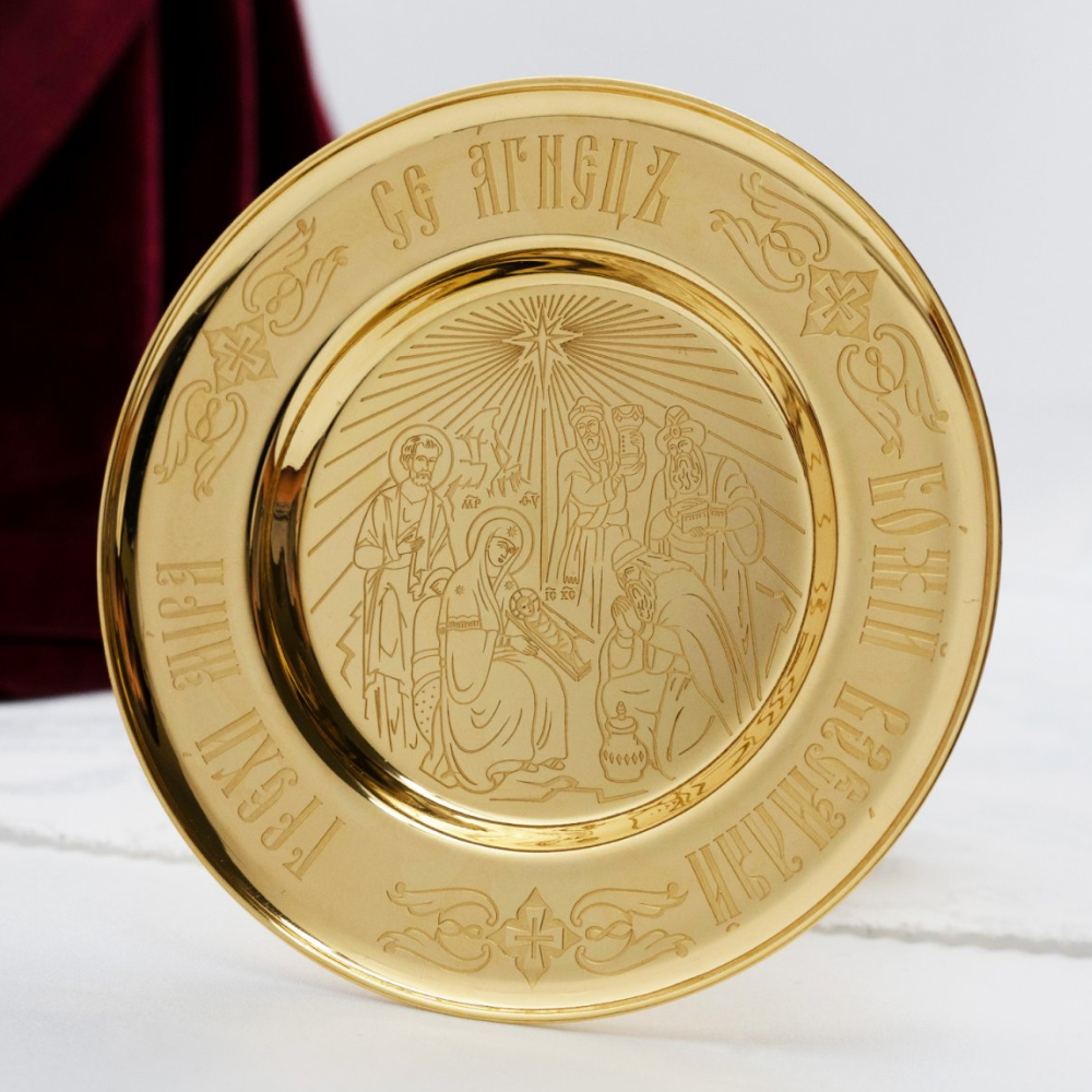 Дискос изготовлен из ювелирного сплава и покрыт тонким слоем золота гальваническим способом. Такая технология нанесения гарантирует неизменный вид изделия на очень длительный срок и простоту в уходе. Образ Рождества Христова и каноничные надписи выполнены при помощи технологии травления, поэтому их неизменный вид гарантирован на все время использования дискоса. Изделие упаковано в презентабельную кожвиниловую упаковку с бархатным ложементом.