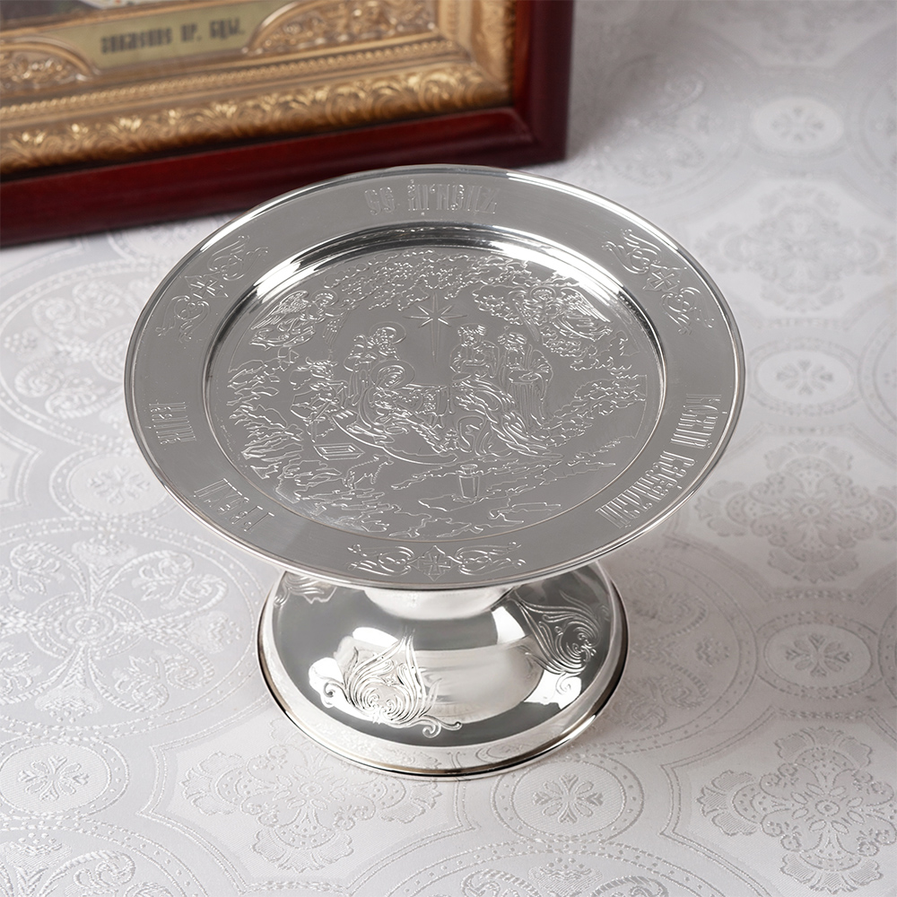 Дискос небольшого размера выполнен из ювелирного сплава, покрытого тонким слоем серебра гальваническим способом. Такое покрытие продлевает срок службы изделия, защищает от внешних неблагоприятных воздействий. Лики и орнамент нанесены при помощи травления. Изделие реализуется в презентабельной упаковке из кожвинила с бархатным ложементом.