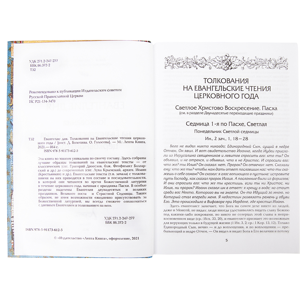 Книга представляет собой уникальный сборник толкований на тексты Евангелия, которые были составлены в разные века христианской истории. В нем представлены мнения святых отцов, среди которых — свт. Григорий Двоеслов, блж. Феофилакт Болгарский и др., а также наших современников — свт. Луки Крымского, архим. Иоанна (Крестьянкина). Фрагменты Евангелия, которые сопровождаются толкованиями, представлены в том же порядке, в котором они прочитываются в течение всего богослужебного года, начиная с дня Светлого Христова Воскресенья. Для удобства поиска чтения двунадесятых и великих праздников, великопостного периода и Страстной седмицы собраны в особом разделе. Поэтому тем, кто не может присутствовать на богослужении, удастся отслеживать текущие чтения и разбирать их самостоятельно, ориентируясь на представленные разъяснения фрагментов.