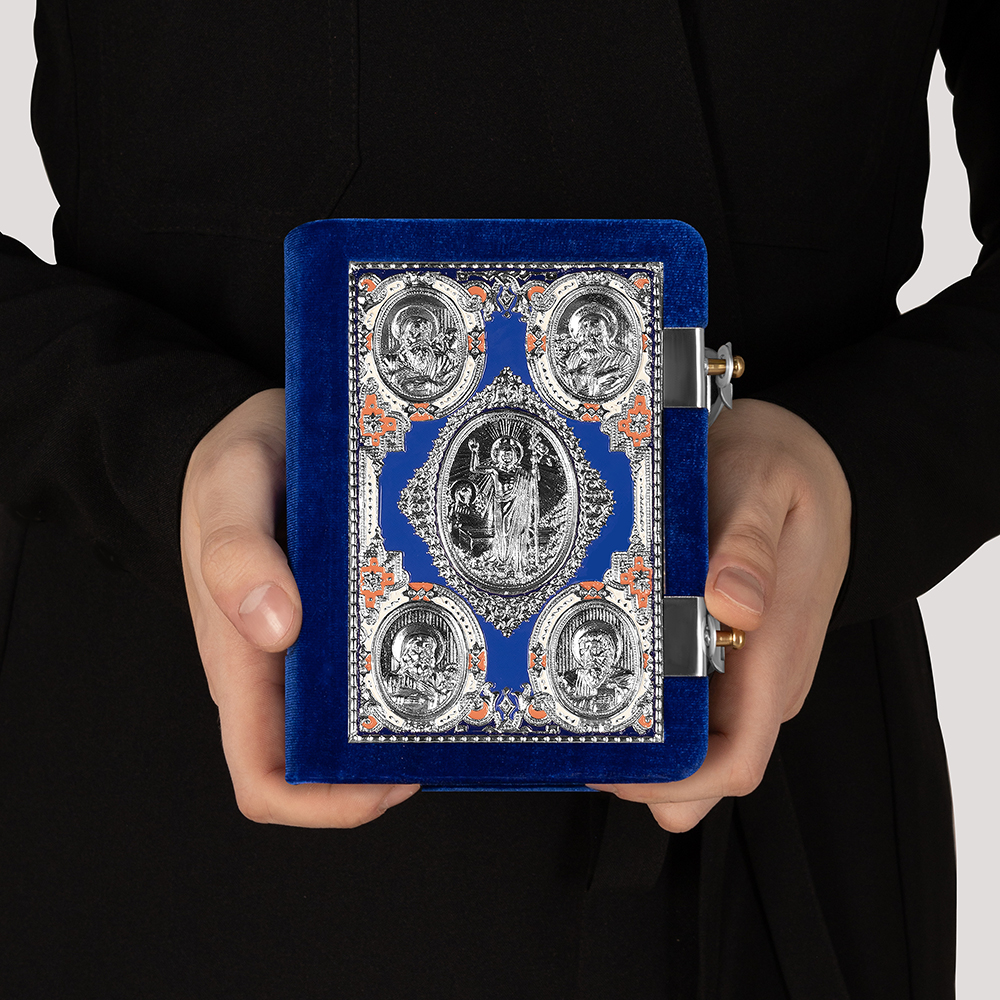 Евангелие требное малое синее, оклад "под серебро", бархат, эмаль, 12х16 см