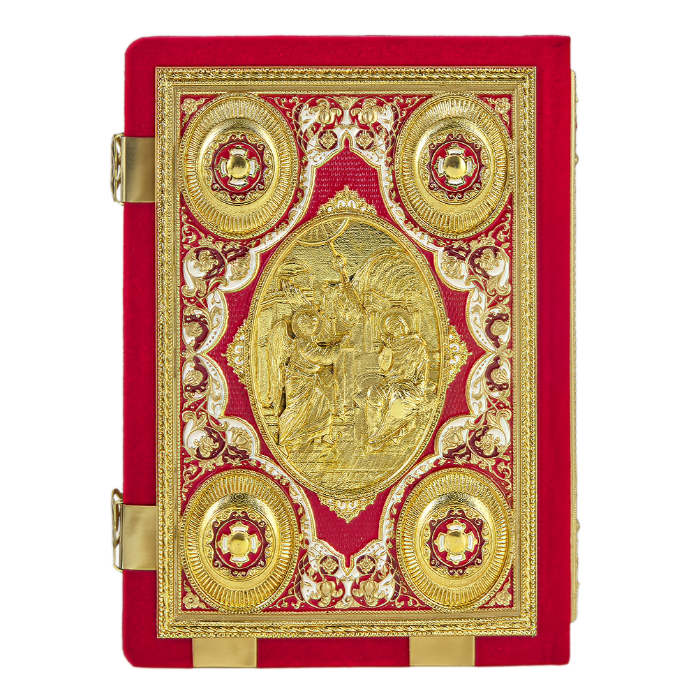 Евангелие напрестольное красное, оклад "под золото", бархат, эмаль, 24х31 см