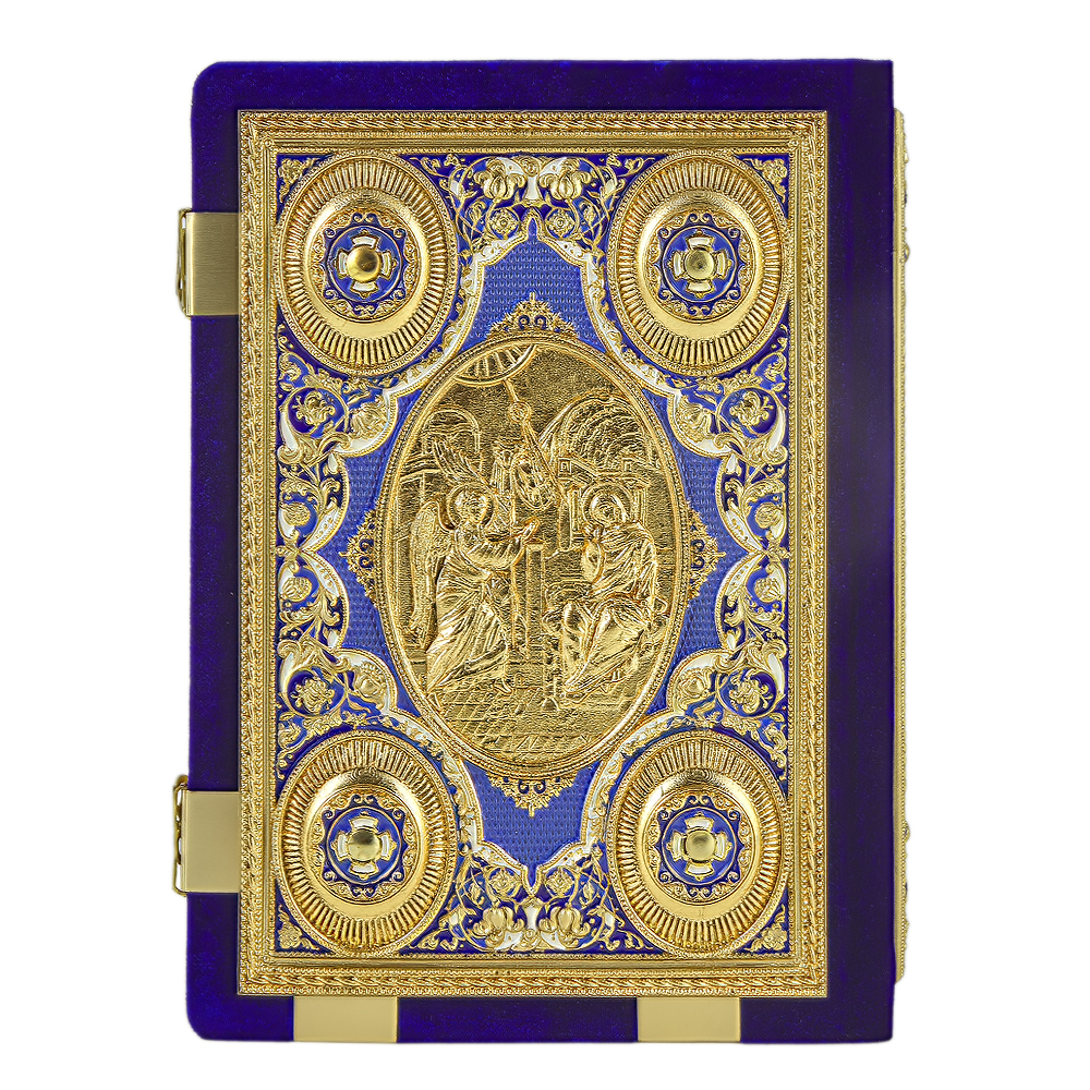 Евангелие напрестольное синее, оклад "под золото", бархат, эмаль, 24х31 см
