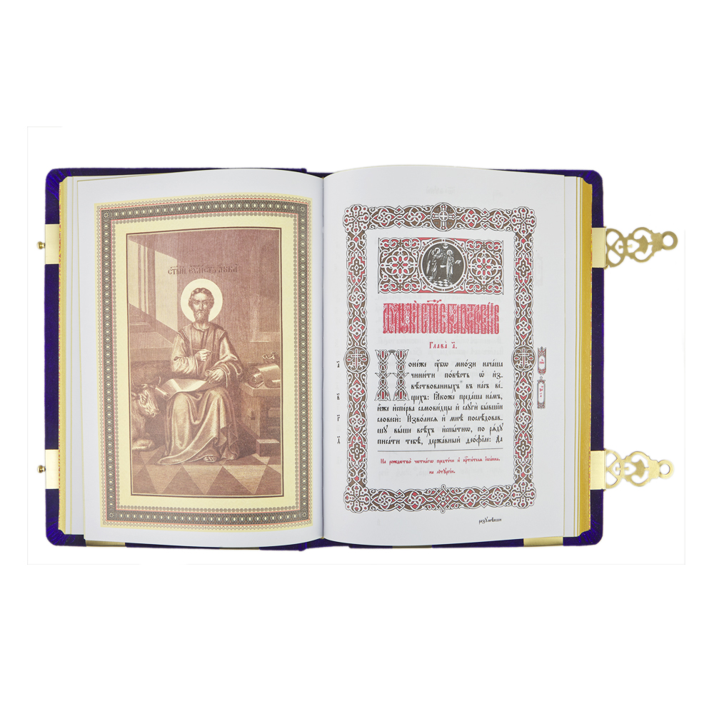 Напрестольное Евангелие большого формата в бархатном переплете с накладками из полиуретанового компаунда, с двумя металлическими застежками. Текст напечатан традиционным церковно-славянским шрифтом в две краски, богато украшен изящными буквицами и орнаментом.
