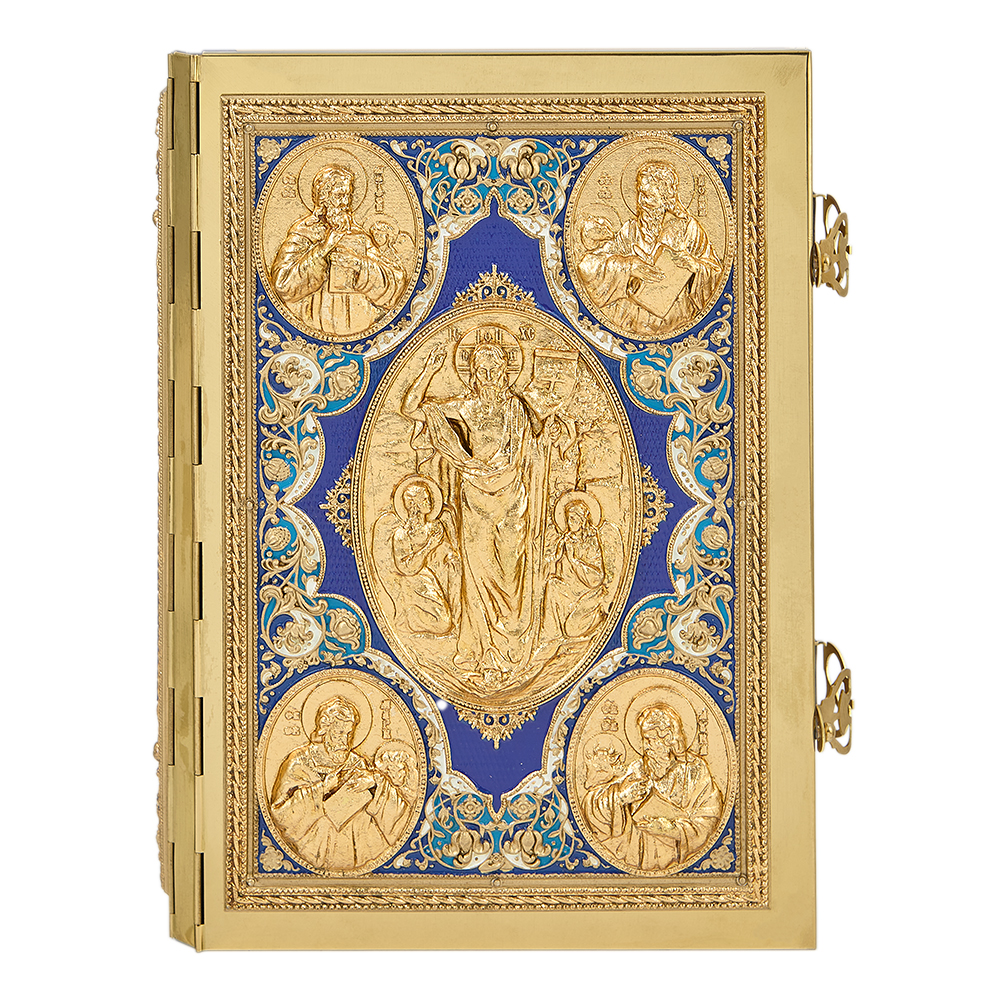 Напрестольное Евангелие большого формата в металлическом окладе с накладками из полиуретанового компаунда, с двумя металлическими застежками. Текст напечатан традиционным церковно-славянским шрифтом в две краски, богато украшен изящными буквицами и орнаментом.