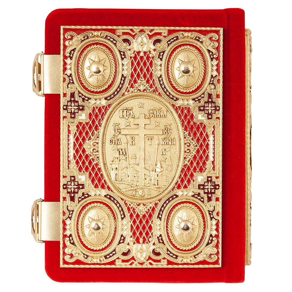 Требное Евангелие малого формата в бархатном переплете с накладками из полиуретанового компаунда, с двумя металлическими застежками. Текст напечатан традиционным церковно-славянским шрифтом в две краски, богато украшен изящными буквицами и орнаментом.