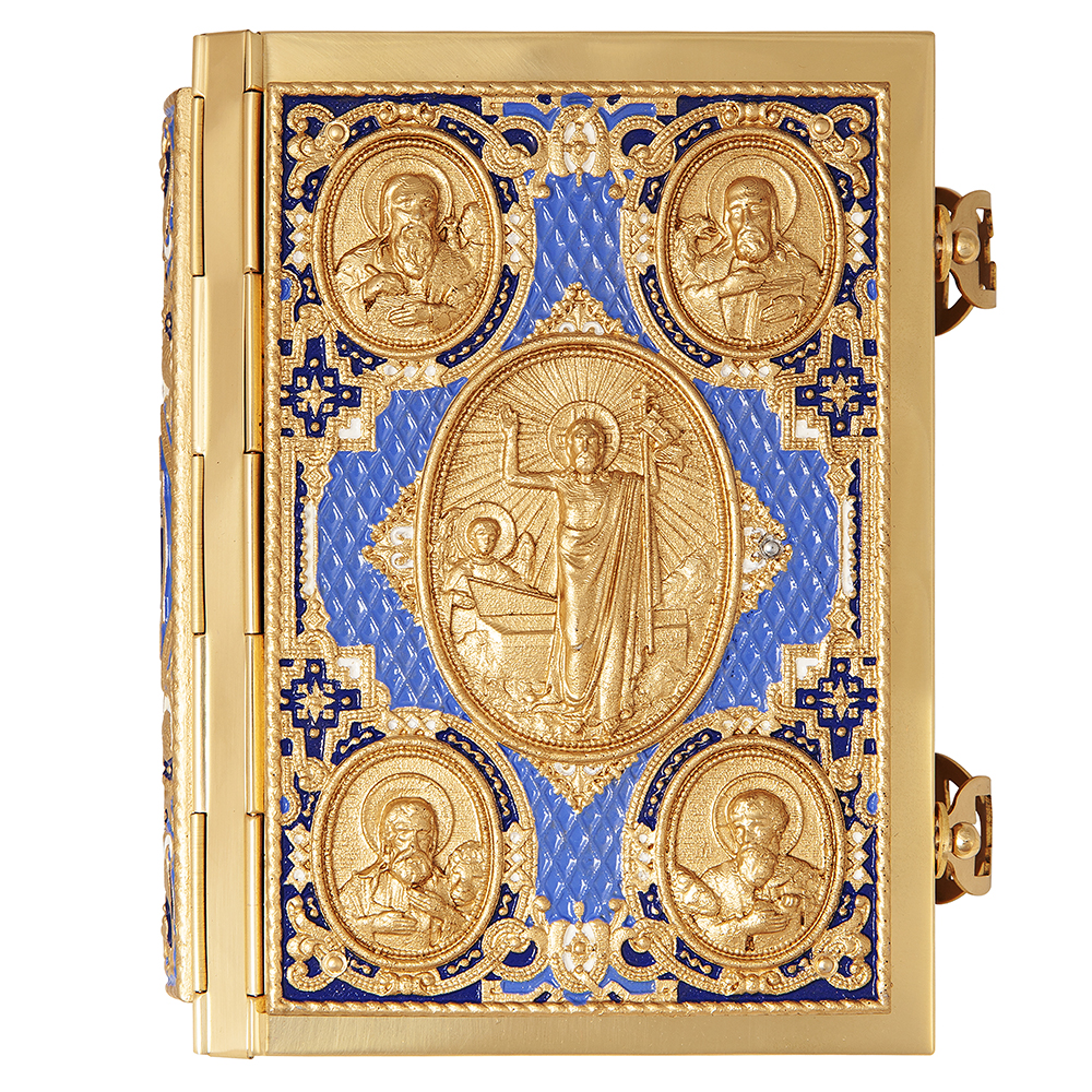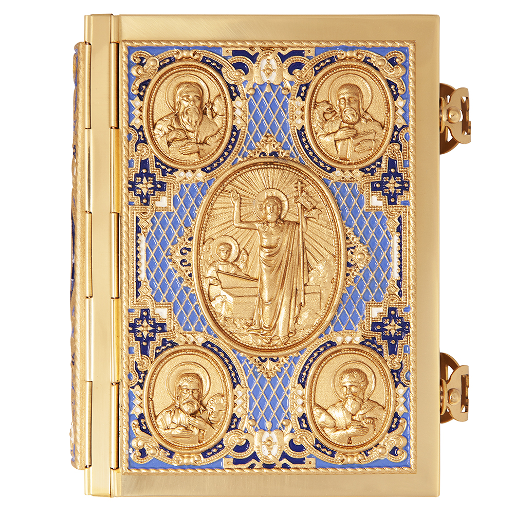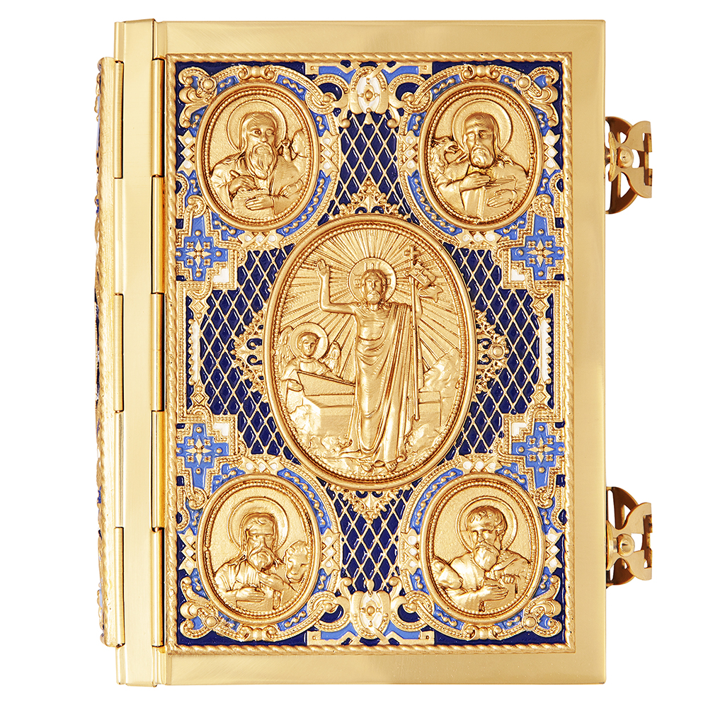 Требное Евангелие малого формата в металлическом окладе с накладками из полиуретанового компаунда, с двумя металлическими застежками. Текст напечатан традиционным церковно-славянским шрифтом в две краски, богато украшен изящными буквицами и орнаментом.