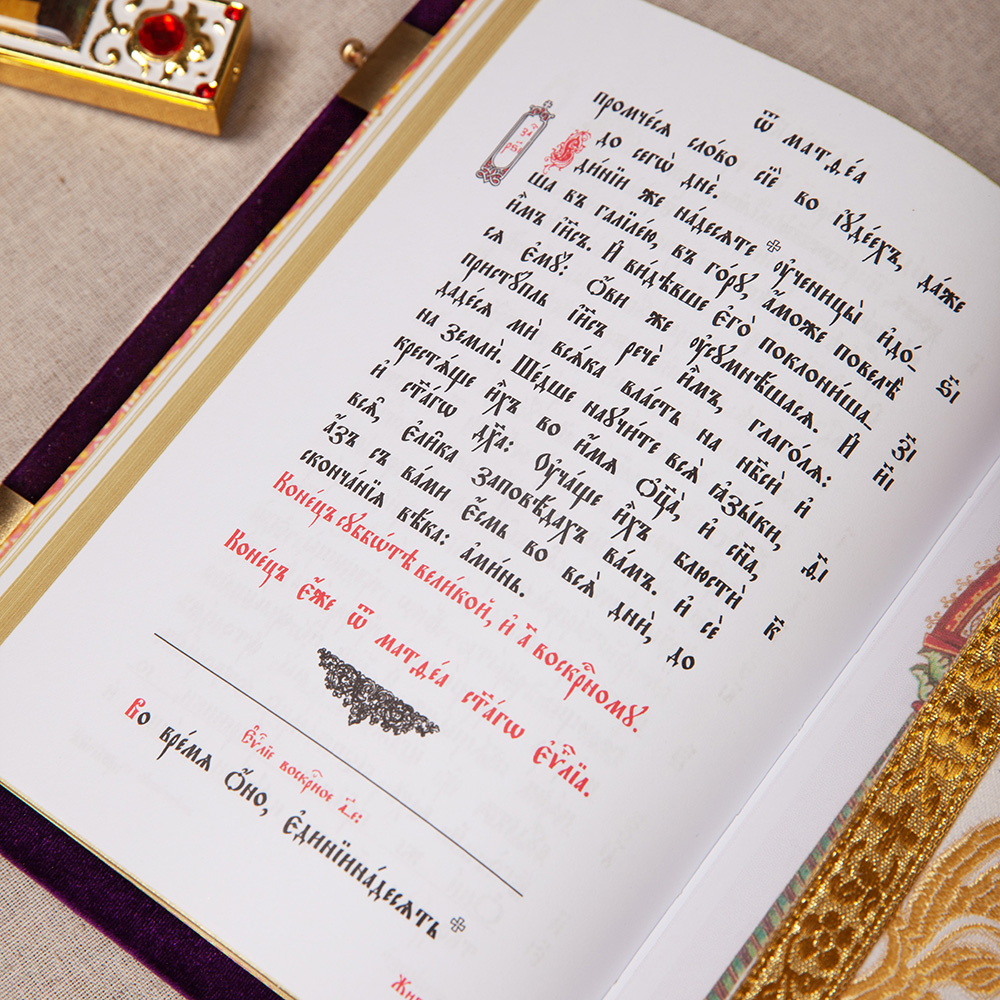 Требное Евангелие среднего формата в бархатном переплете с накладками из полиуретанового компаунда, с двумя металлическими застежками. Текст напечатан традиционным церковно-славянским шрифтом в две краски, богато украшен изящными буквицами и орнаментом.