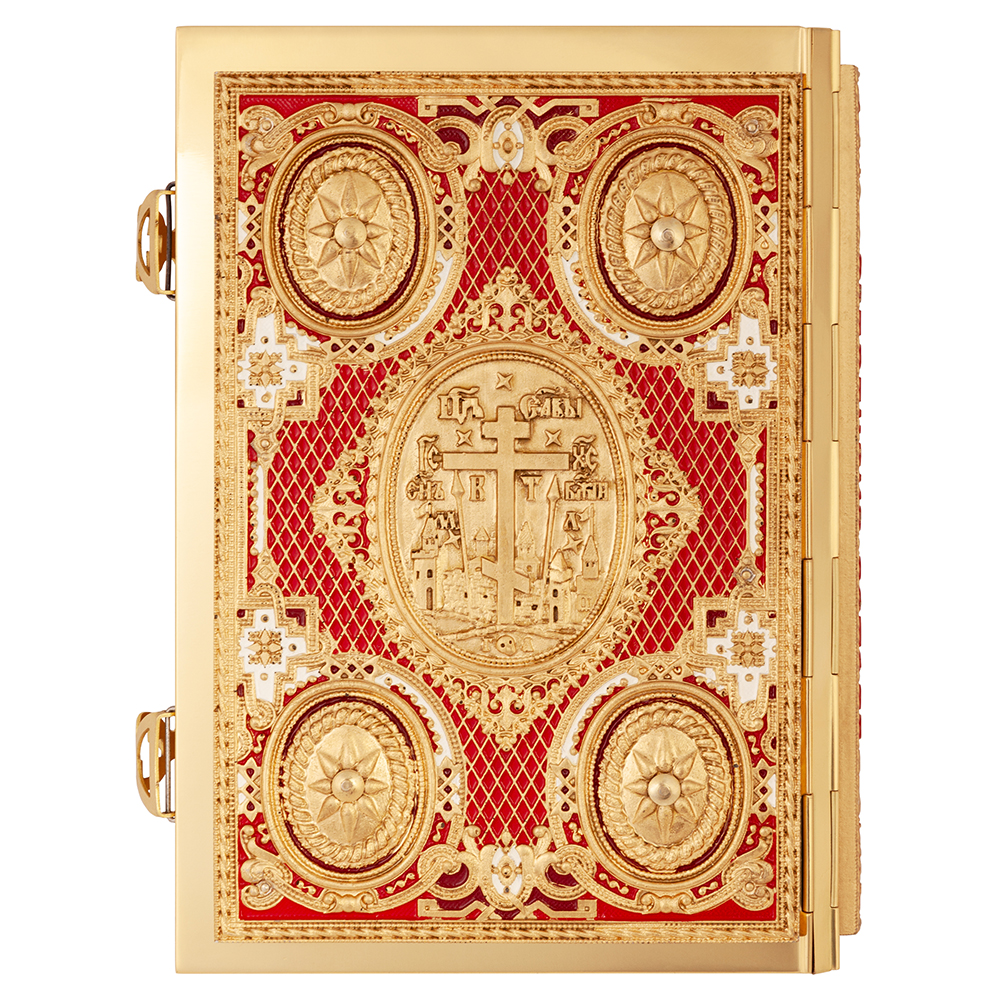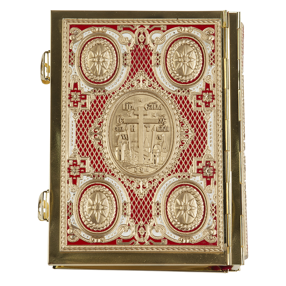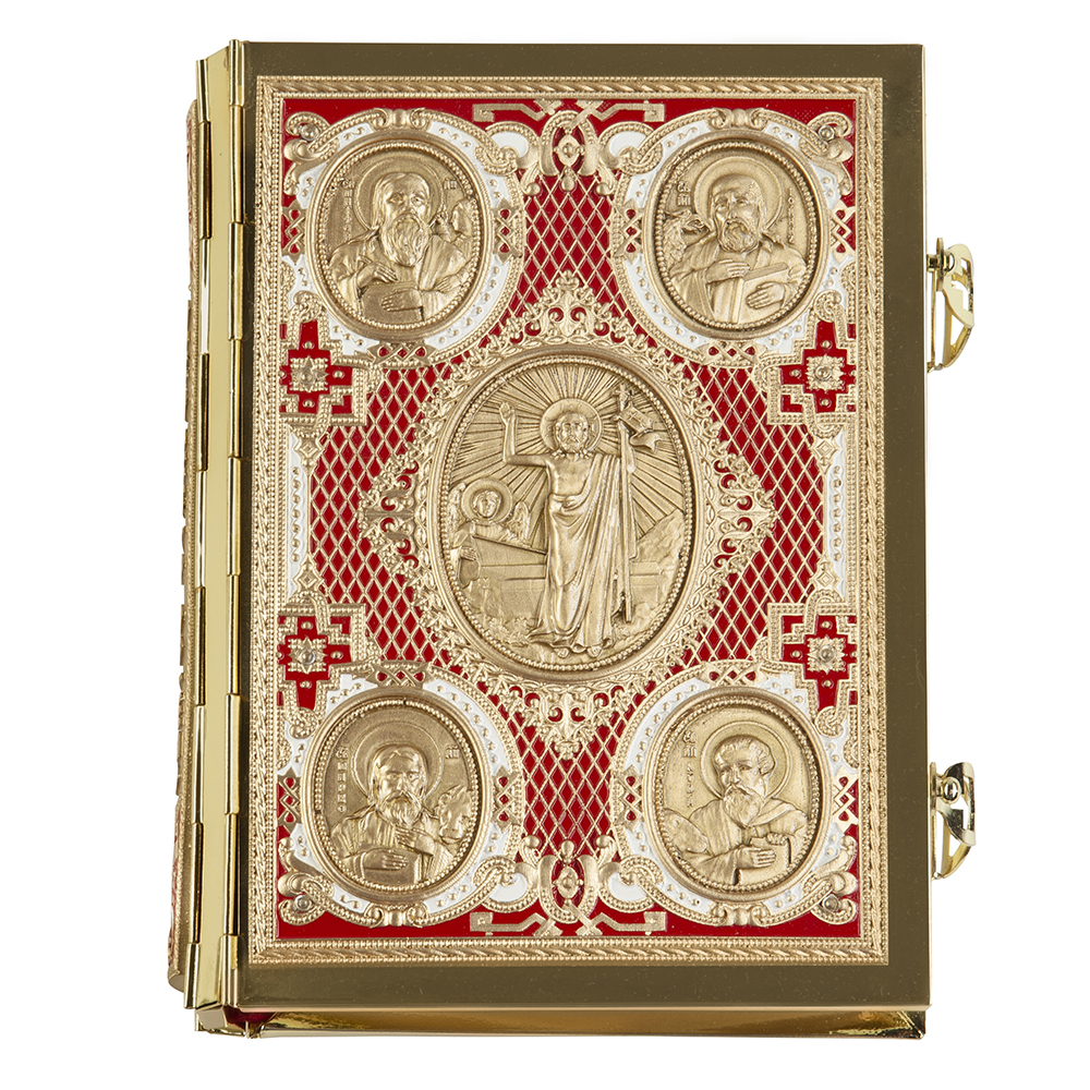 Требное Евангелие среднего формата в металлическом окладе с накладками из полиуретанового компаунда, с двумя металлическими застежками. Текст напечатан традиционным церковно-славянским шрифтом в две краски, богато украшен изящными буквицами и орнаментом.