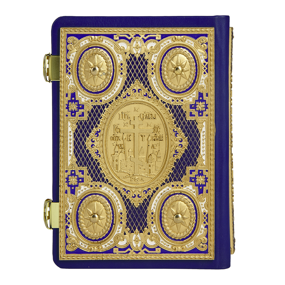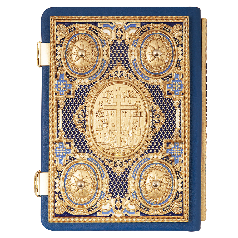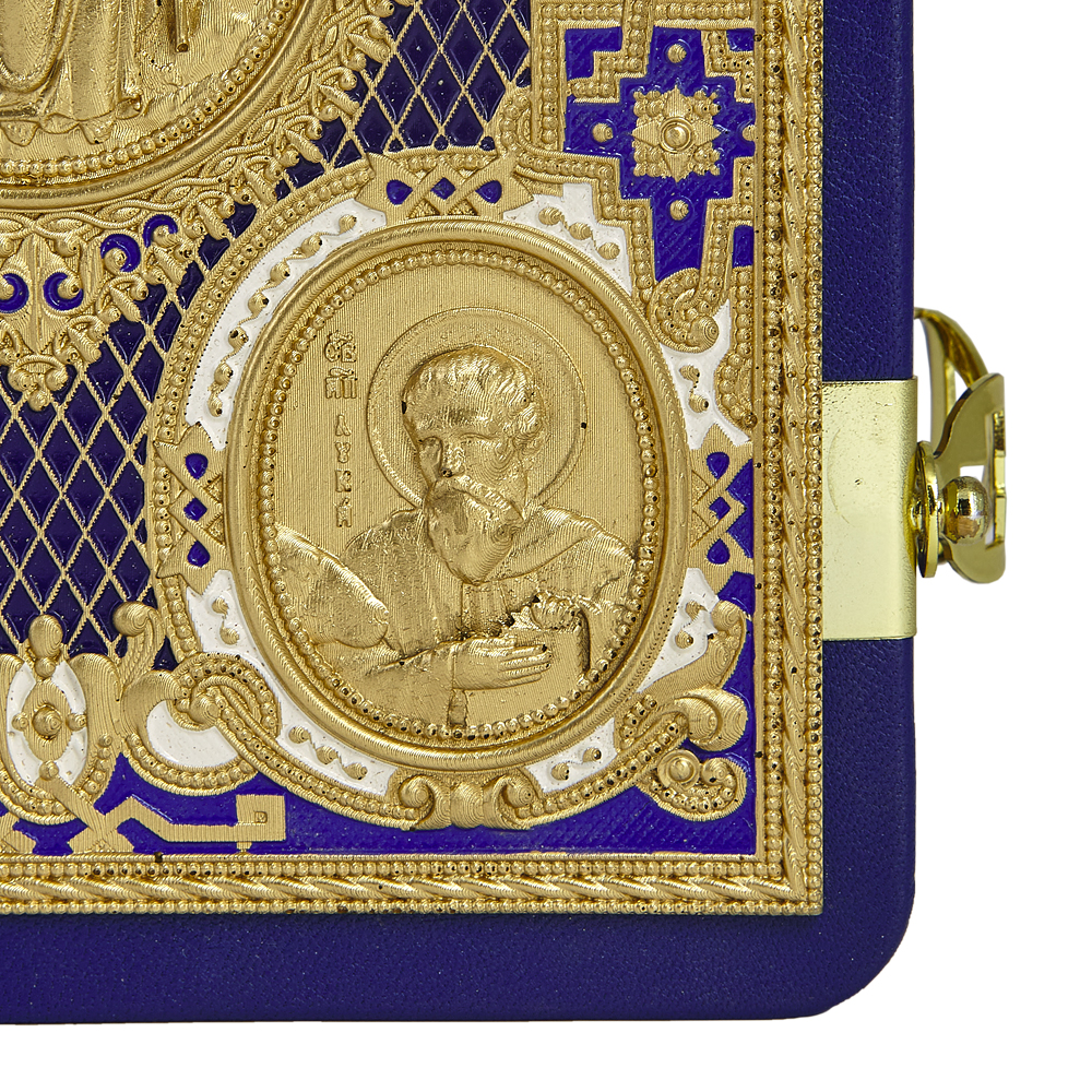 Евангелие требное среднее синее, оклад "под золото", кожа, эмаль, 17х22 см