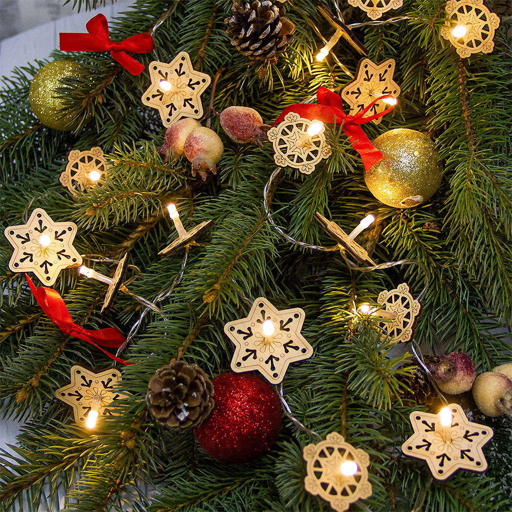 Гирлянда светодиодная "Снежинки" на 20 ламп. Необычная двухметровая гирлянда подходит для украшения рождественской елки и дома: с ее помощью можно декорировать окна, стены, праздничный стол. На прозрачном шнуре со светодиодными лампочками располагаются 10 деревянных звездочек и 10 снежинок, которые, при желании, можно раскрасить - благодаря этому гирлянда превращается в набор для творчества. Это светящееся украшение создаст тёплую и уютную атмосферу в доме и станет чудесным подарком для близких и друзей. Декор комнат резными гирляндами возможен в любое время года.