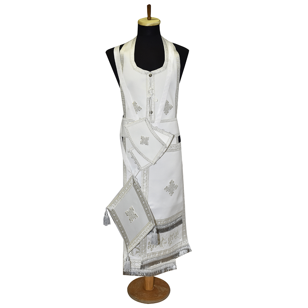 В комплект входят 6 предметов: фелонь, епитрахиль, пояс, поручи, палица и набедренник.