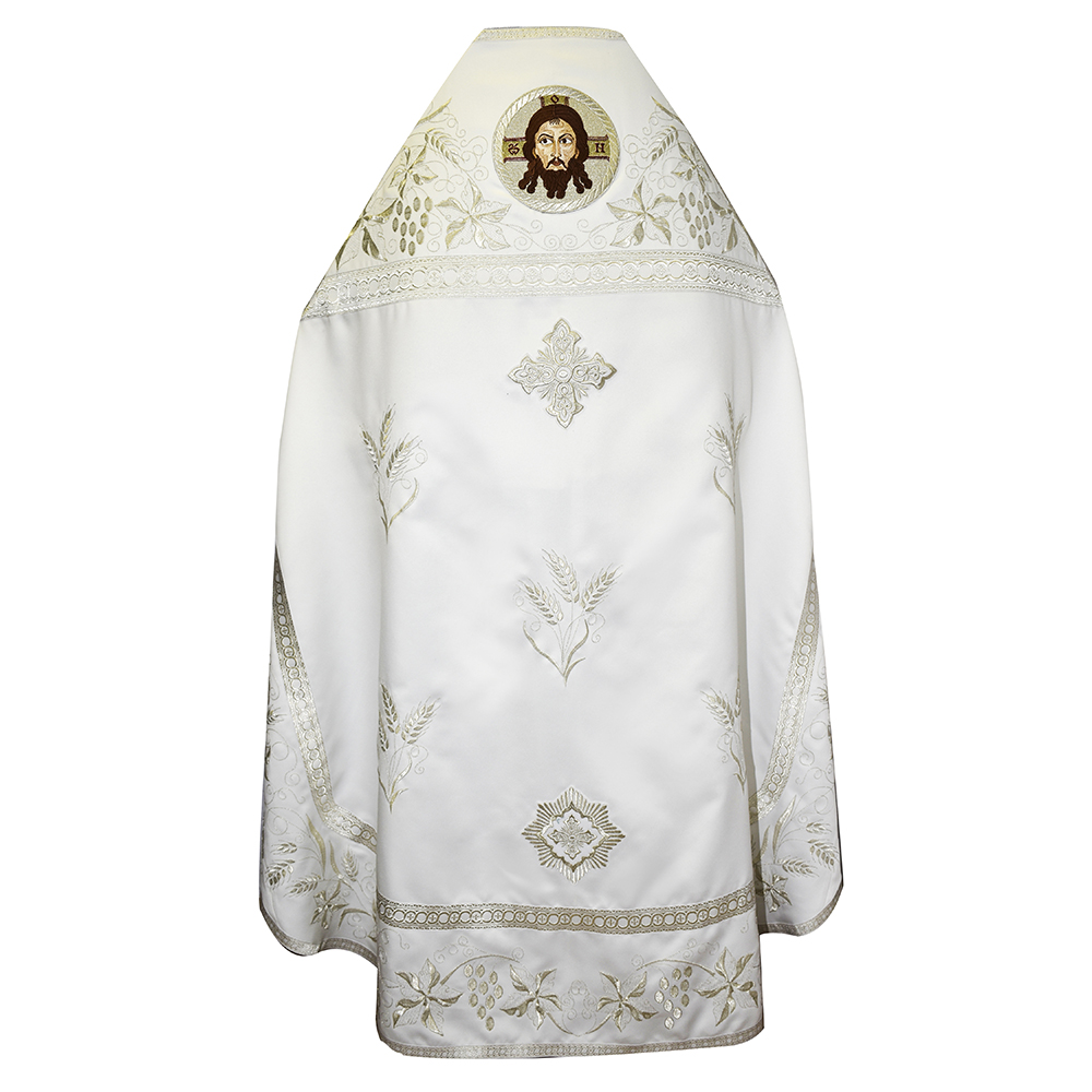 Иерейское облачение пошито из ткани белого цвета с отделкой галуном в цвет облачения. Оплечье, нижние окошки епитрахили, а также низ набедренника украшены вышивкой "Виноградная лоза", на фелони - вышитая икона "Спас Нерукотворный". По желанию свис передней части фелони можно сделать укороченным.