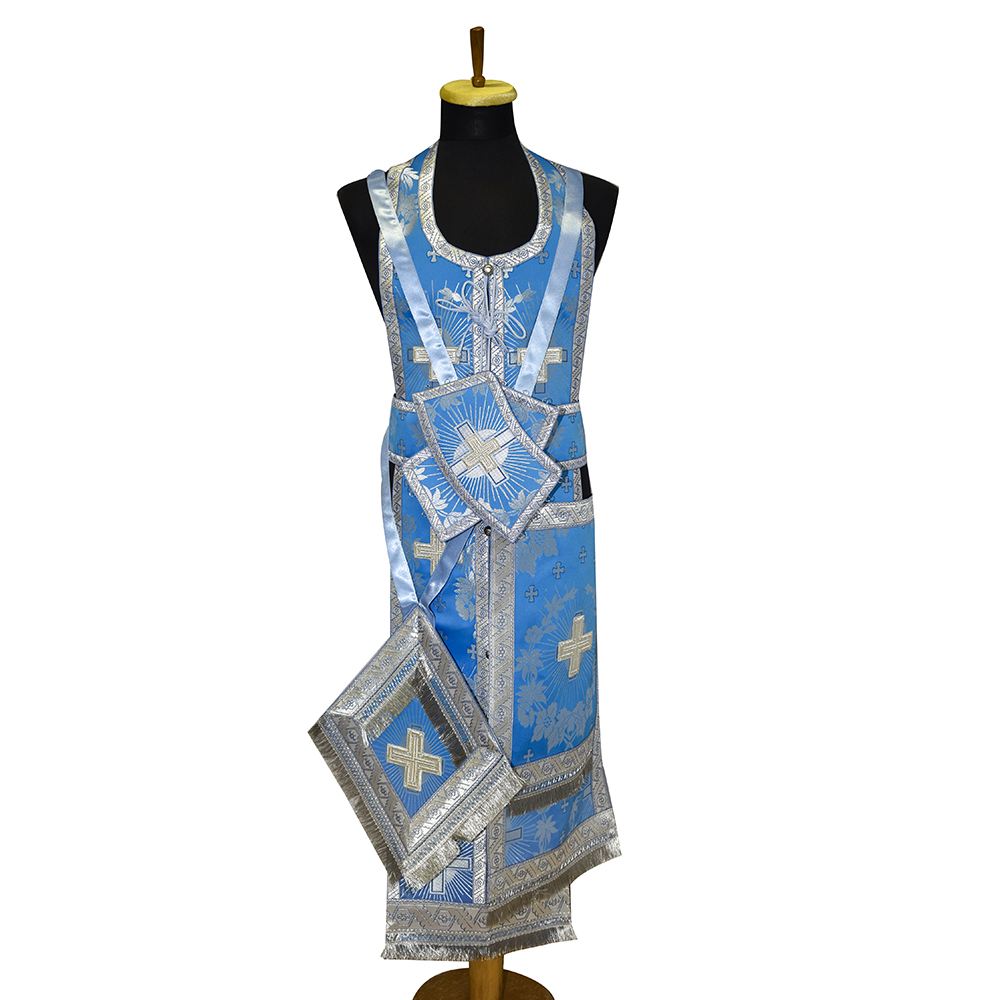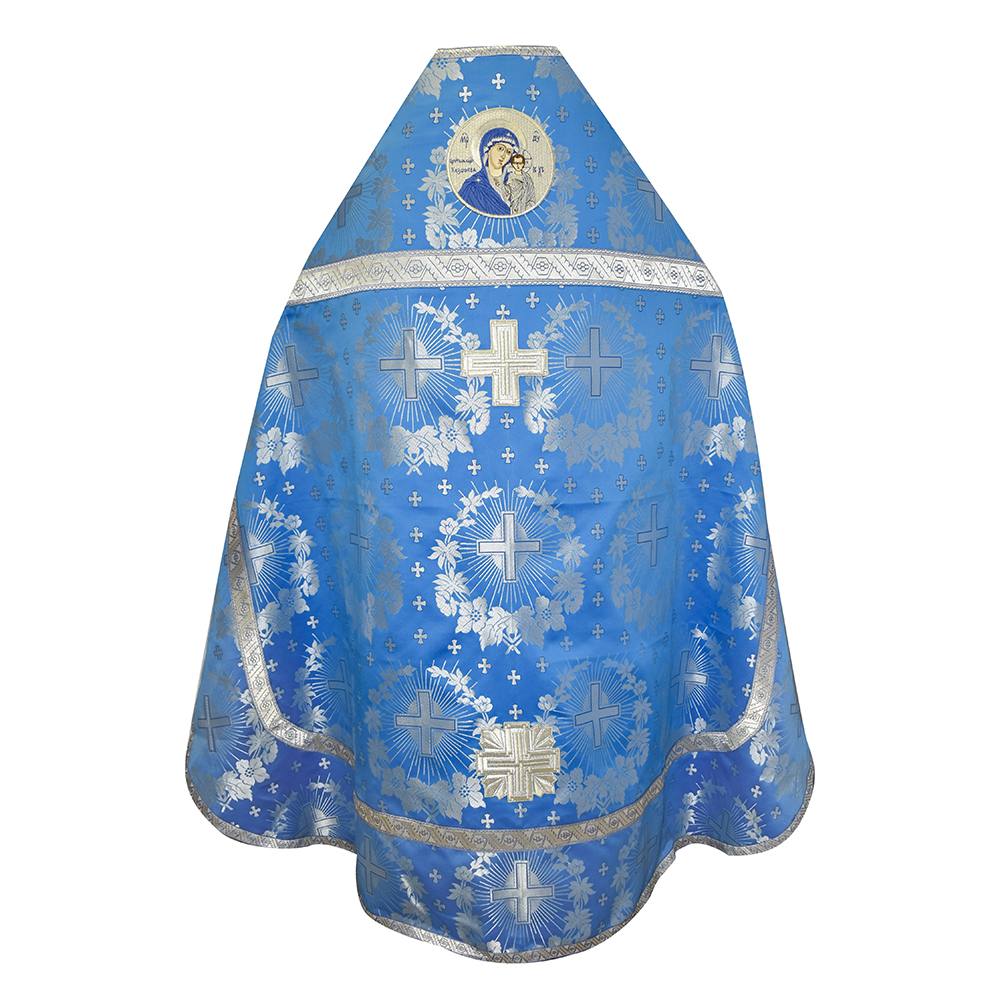 Иерейское облачение сшито из парчи голубого цвета с серебряным узорным орнаментом, с отделкой галуном в цвет облачения с рисунком, на фелони - вышитая икона Божией Матери "Казанская". Кресты на фелони и епитрахили, икона выполнены с помощью машинной вышивки. По желанию свис передней части фелони можно сделать укороченным.