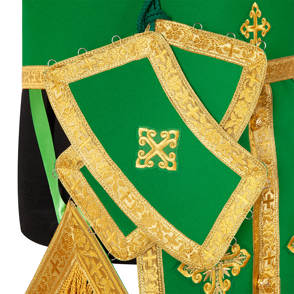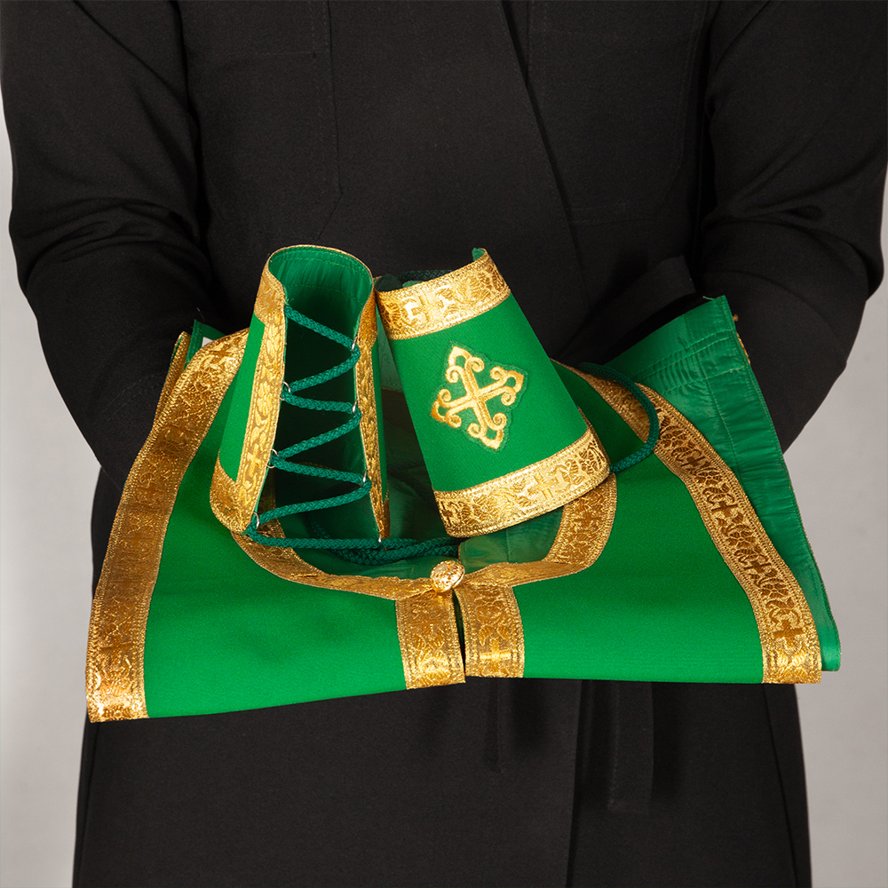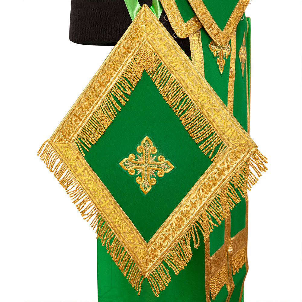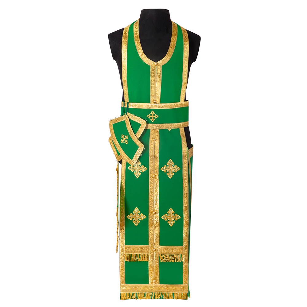 В комплект входят 6 предметов: фелонь, епитрахиль, пояс, поручи, палица и набедренник.