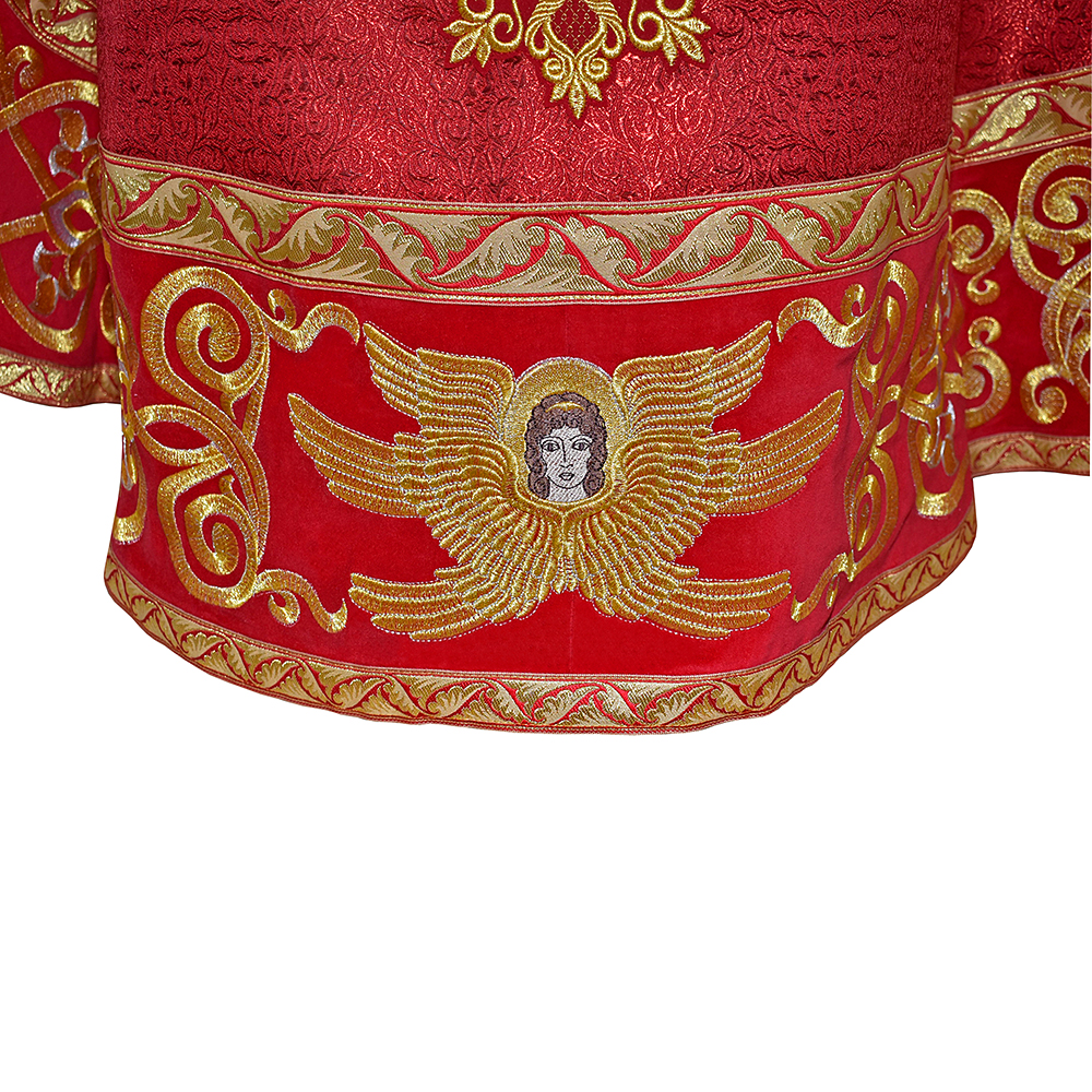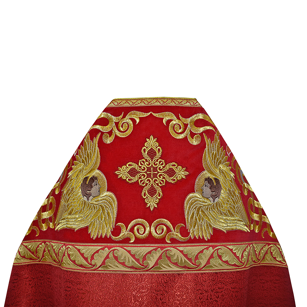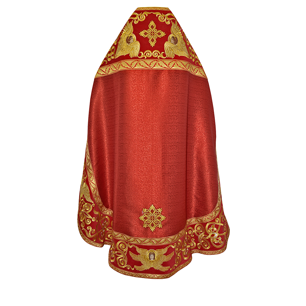 Русское иерейское облачение из парчи и бархата красного цвета с вышивкой смотрится очень торжественно. Такая фелонь соответствует духу праздника Пасхи и достойна быть надетой даже на архиерейское богослужение.