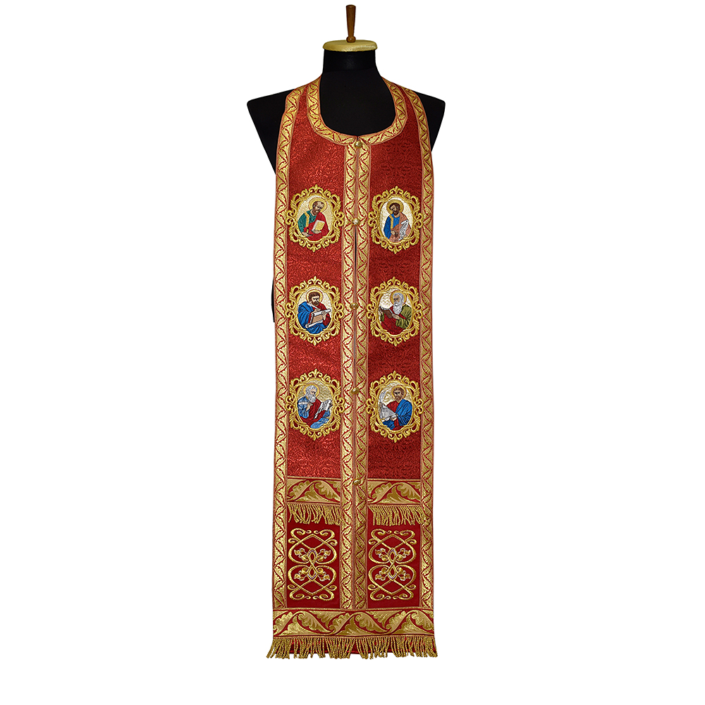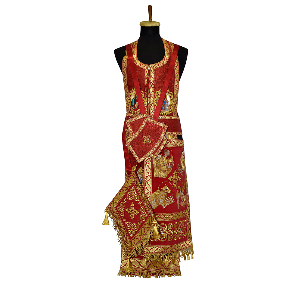 На набедреннике вышиты символические изображения четырех евангелистов, на епитрахили - евангелисты и апостолы Петр и Павел. Кроме того, набедренник декорирован аккуратными кистями, которые не будут мешать при совершении богослужения.