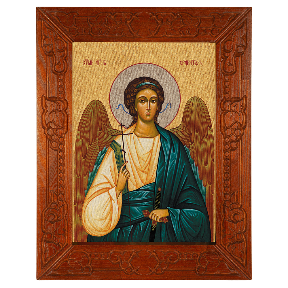 Икона Ангела Хранителя, в узкой резной раме, цвет "кипарис", холст с золочением, ширина рамы 7 см